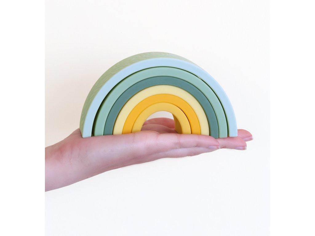 Silikónová stohovacia hračka určená pre hru s otvoreným koncom. Táto hračka je všestranná, vhodná pre vnútorné aj vonkajšie použitie, nech už vo vani alebo na pieskovisku. Je vhodná pre viac vekových kategórií vrátane bábätiek. Jednotlivé dieliky možno skladať na seba, skladať, vyvažovať a dokonca ich používať ako hryzaciu hračku. Hračka sa ľahko čistí. Parametre a údržba: • Rozmery zostavenej dúhy sú 14,5 x 6,8 x 4 cm. • Materiál: potravinársky silikón. • Údržba: otrite vlhkou handričkou a mydlovou vodou a nechajte uschnúť.Dodatočné parametre