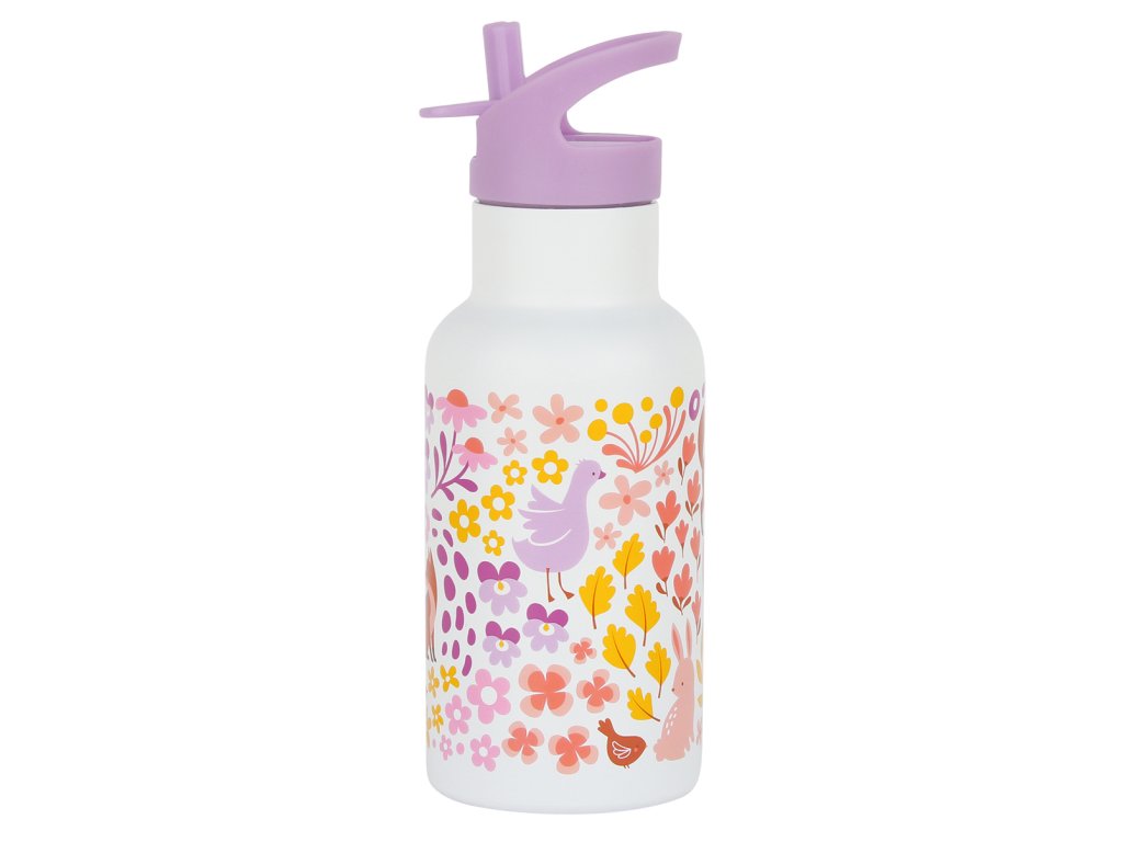 Antikorová dvojstenná fľaša s objemom 350 ml s motívom zvieratiek v kvetinovej záhradke je ideálnou voľbou pre deti do škôlky, školy alebo na výlety. Fľaša je dodávaná s otočným uzáverom, výlevkou na pitie a slamkou na studené nápoje. Prečo si túto fľašu zamilujú deti aj rodičia? Praktická a krásna: veselá potlač okamžite zaujme každé dieťa! Funkčný dizajn: dvojstenná konštrukcia pre maximálnu izoláciu. Ľahké použitie: s hubicou a slamkou bude pitie hračka. Kvalitný materiál: fľaša je vyrobená z antikorovej ocele a uzáver z odolného PP materiálu.