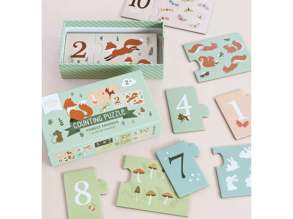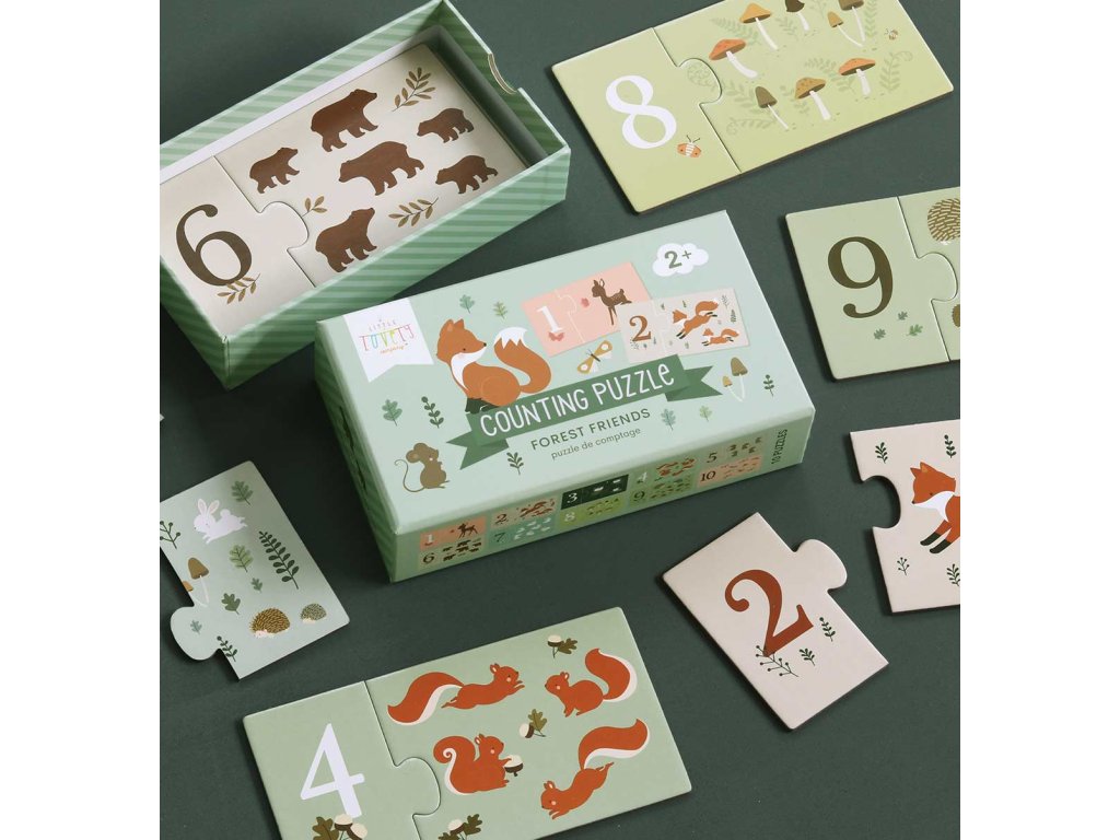 Naučte svoje deti počítať zábavným spôsobom s touto skladačkou s kamarátmi z lesa. Puzzle sa skladá z 10 dvojdielnych hádaniek a je vhodné pre deti od 2 rokov. Úlohou detí je spojiť číslo so správnym obrázkom podľa počtu zvieratiek. Dieliky puzzle sú vyrobené z pevného kartónu, a sú dostatočne veľké aj pre malé detské ručičky. Puzzle je uložené v praktickej škatuľke pre ľahké skladovanie. Parametre: • Rozmery balenia sú 16,7 x 9,7 x 4,4 cm.Dodatočné parametre