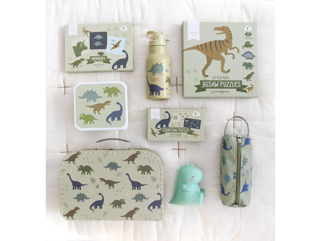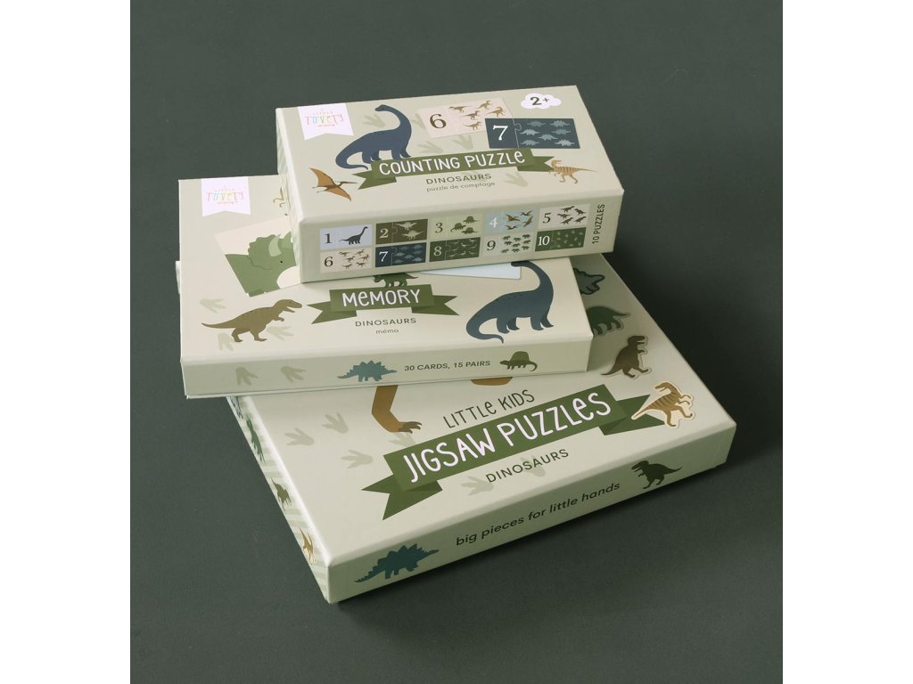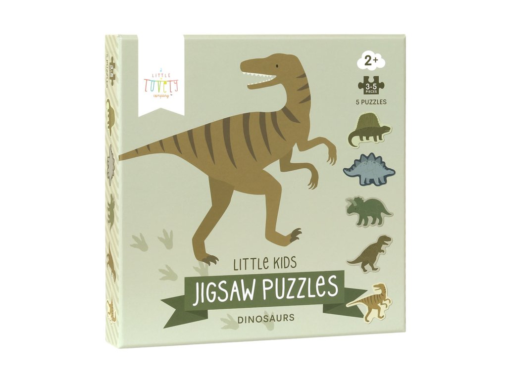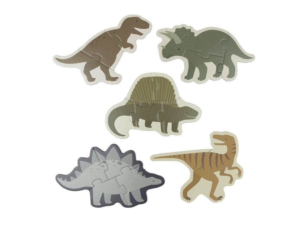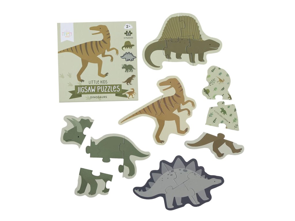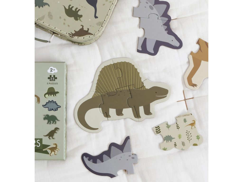 Súprava piatich puzzle s dinosaurami je špeciálne navrhnutá pre deti od 2 rokov. Každá skladačka sa skladá z 3 až 5 veľkých dielikov. Puzzle sú vyrobené z pevného kartónu, sú dostatočne veľké pre malé detské ručičky. Skladanie puzzle je pre deti skvelá aktivita, ktorá vaše dieťa zabaví na dlhú dobu a zároveň je rozvíjajúca. Skladanie puzzle vyžaduje pozornosť, sústredenie a trpezlivosť a ponúka deti hľadať možnosti a riešenia. Puzzle sú dodávané v pevnej kvalitnej škatuľke. Parametre: • Rozmery balenia sú 22,2 x 22,5 x 4 cm.Dodatočné parametre