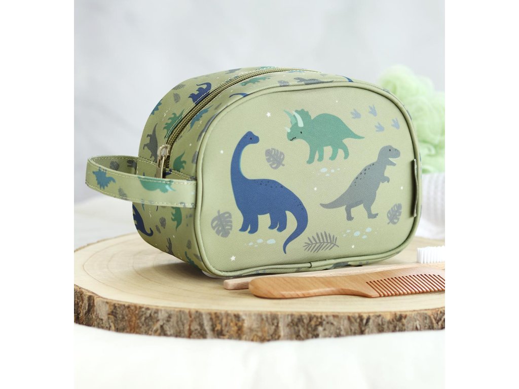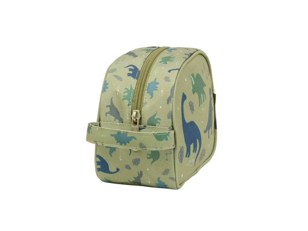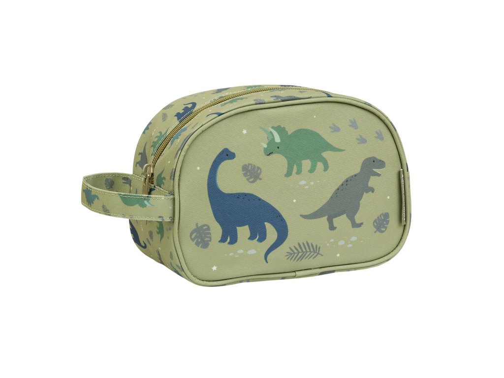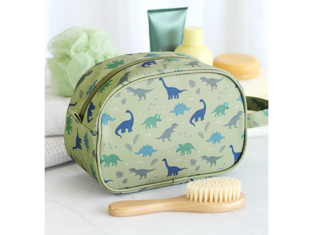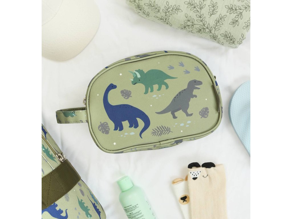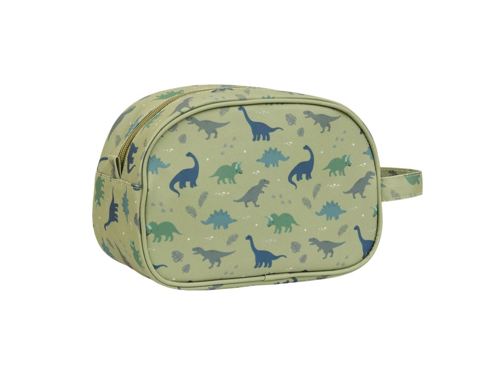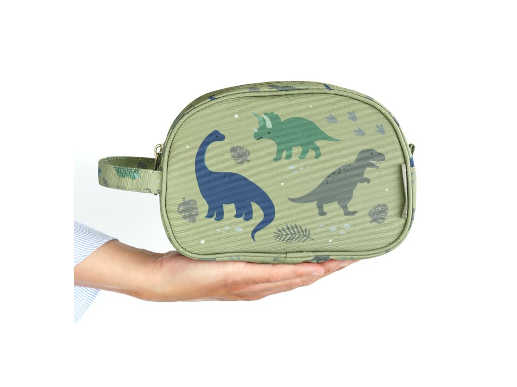 Toaletná taštička s dinosaurami je ideálna na výlety, na letné tábory alebo na dovolenku. Toaletná taštička ponúka priestornú priehradku s dostatkom miesta na šampón, mydlo, zubnú kefku, zubnú pastu a ďalšie nevyhnutné potreby. Toaletná taštička má tiež praktickú rukoväť pre ľahké prenášanie a zavesenie. Rozmery taštičky sú 20,5 x 14 x 9,5 cm. Neperte v práčke, odporúčame iba ručné pranie.