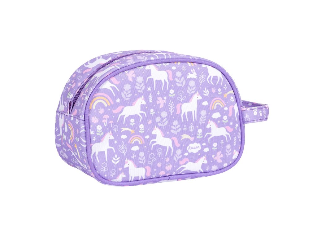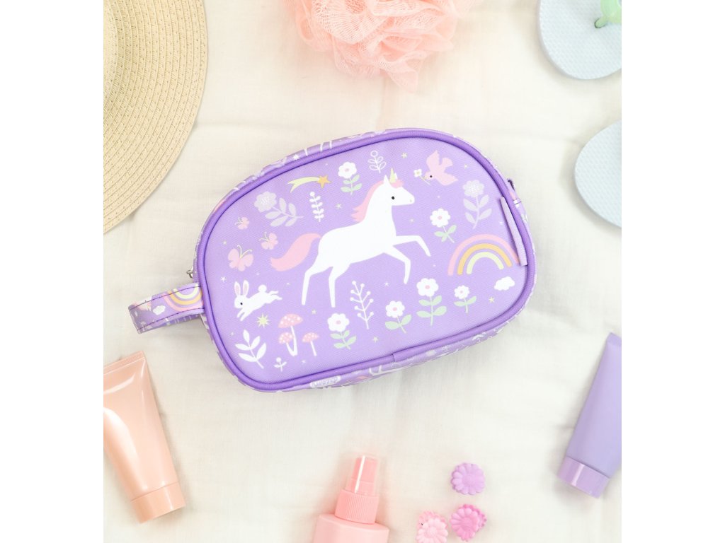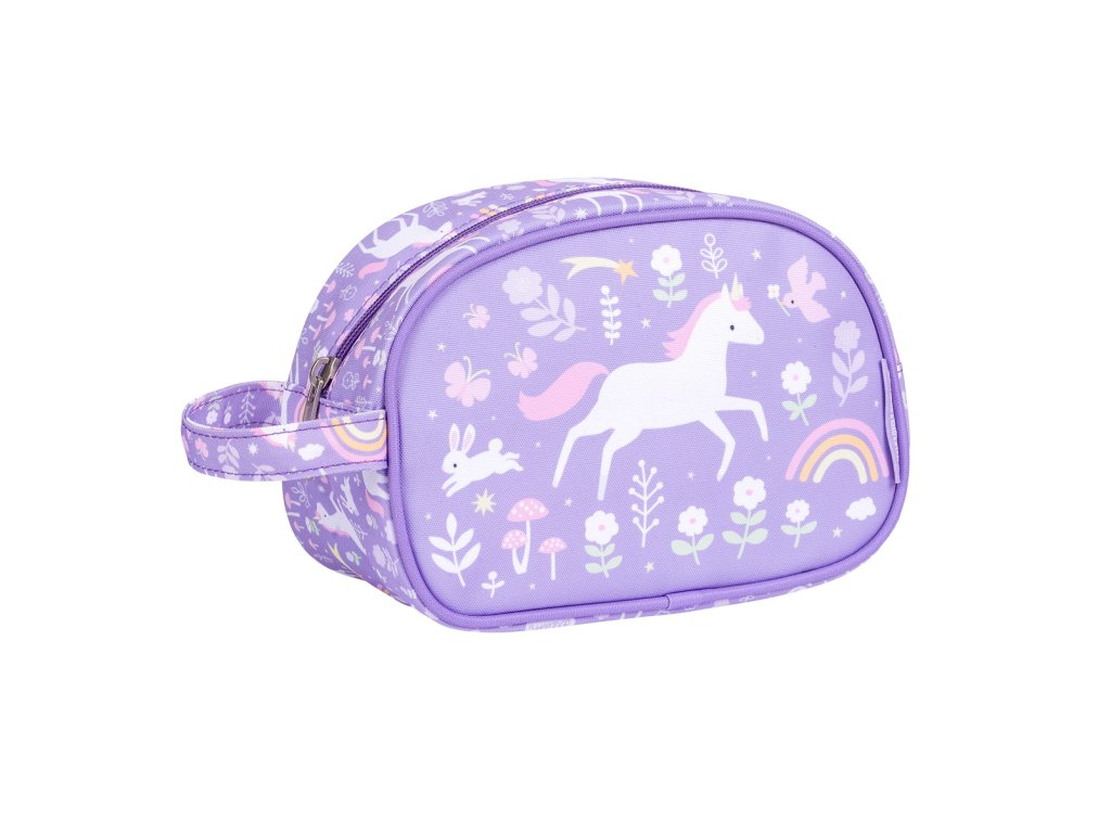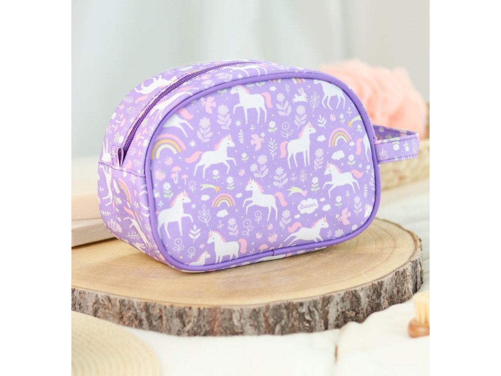 Toaletná taštička s jednorožcami a dúhou je ideálna na výlety, na letné tábory alebo na dovolenku. Toaletná taštička ponúka priestornú priehradku s dostatkom miesta na šampón, mydlo, zubnú kefku, zubnú pastu a ďalšie nevyhnutné potreby. Toaletná taštička má tiež praktickú rukoväť pre ľahké prenášanie a zavesenie. Rozmery taštičky sú 20,5 x 14 x 9,5 cm. Neperte v práčke, odporúčame iba ručné pranie.