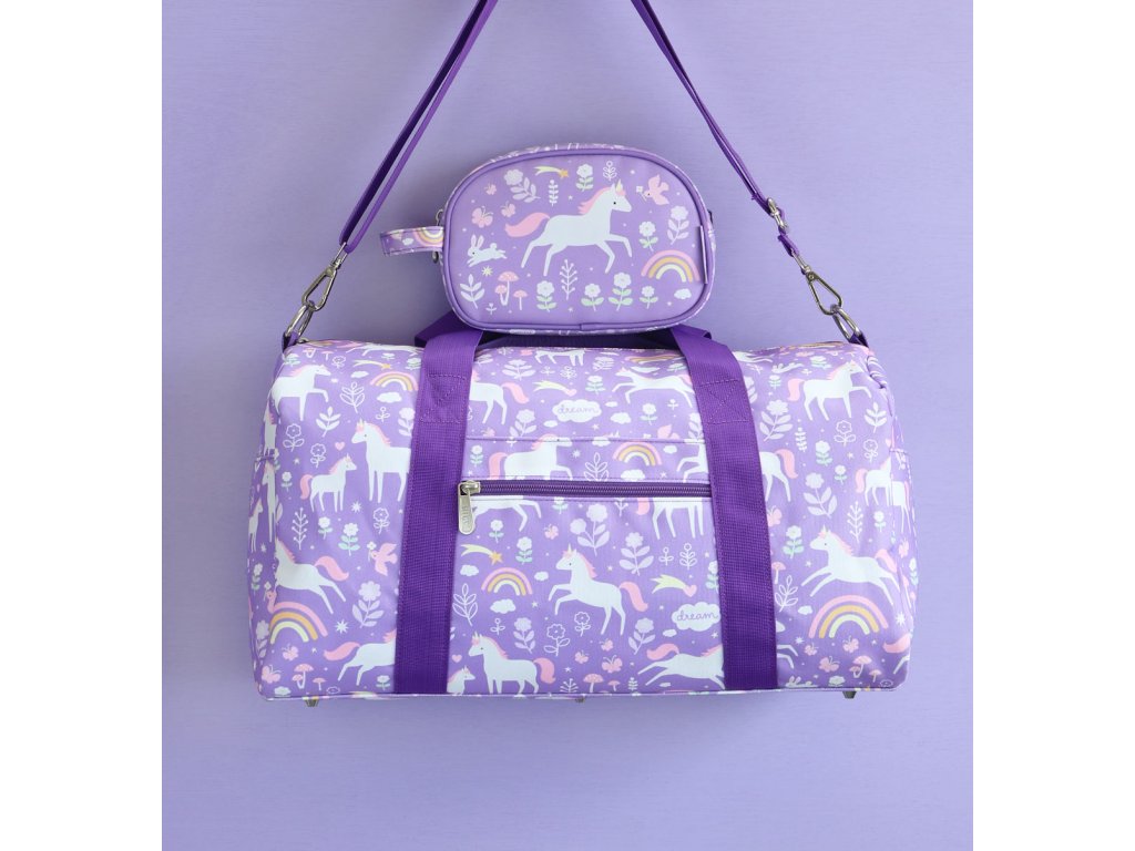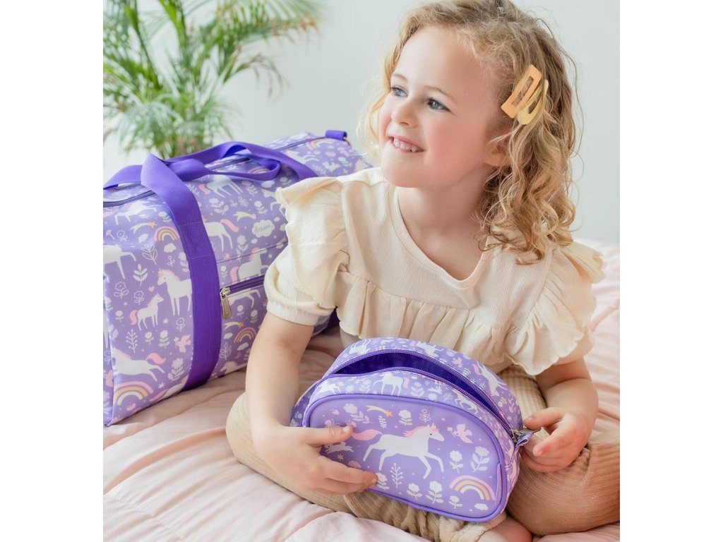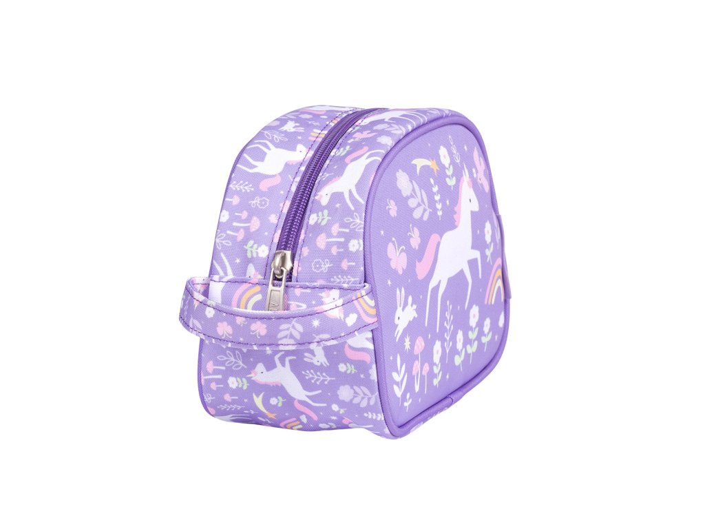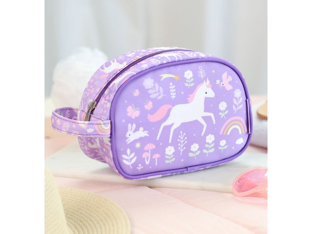 Toaletná taštička s jednorožcami a dúhou je ideálna na výlety, na letné tábory alebo na dovolenku. Toaletná taštička ponúka priestornú priehradku s dostatkom miesta na šampón, mydlo, zubnú kefku, zubnú pastu a ďalšie nevyhnutné potreby. Toaletná taštička má tiež praktickú rukoväť pre ľahké prenášanie a zavesenie. Rozmery taštičky sú 20,5 x 14 x 9,5 cm. Neperte v práčke, odporúčame iba ručné pranie.