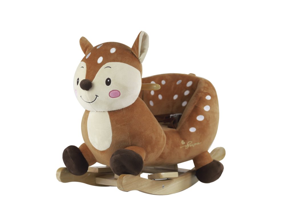 Hojdací jelenček rozžiari oči aj tým najmenším deťom! Roztomilé hojdacie zvieratko je ako stvorené pre deti už od 9 mesiacov. Vďaka hebkému plyšovému povrchu a útulnému tvaru si deti jelenčeka zamilujú a z detskej izbičky sa rýchlo stane ich obľúbené miesto. Hojdačka je vybavená mäkkým, pohodlne polstrovaným sedadlom s bezpečnostným pásom, ktoré poskytuje maximálne pohodlie a ochranu aj tým najmenším deťom. Hojdanie prirodzene podporuje motoriku, rozvíja rovnováhu a napomáha pohybovej aktivite. Stabilná konštrukcia z masívneho dreva má ochranu proti prevráteniu, deti sa môžu držať drevených držadiel a nôžky si pohodlne oprieť o opierky. Nízka výška sedadla (cca 14 cm) uľahčuje malým deťom bezpečné nasadanie aj zosadanie.