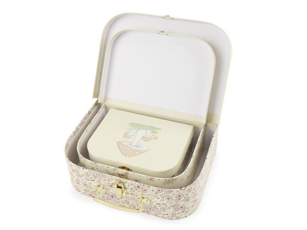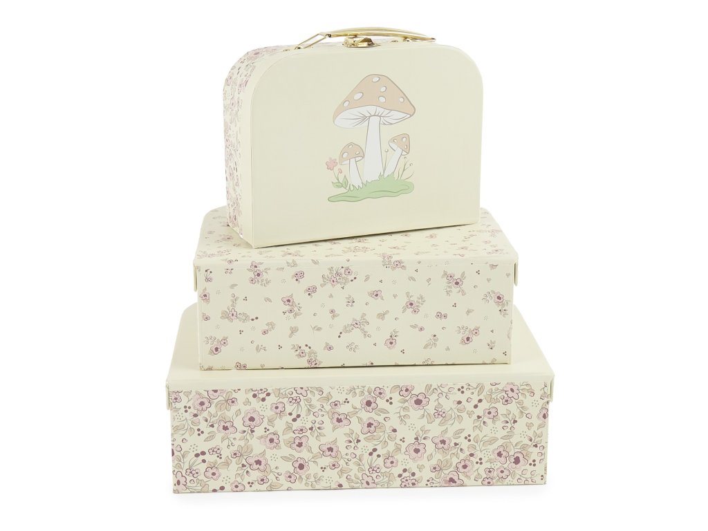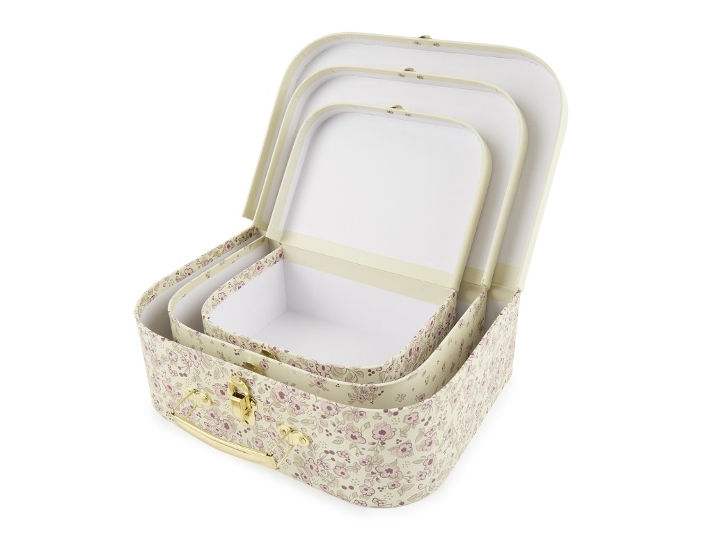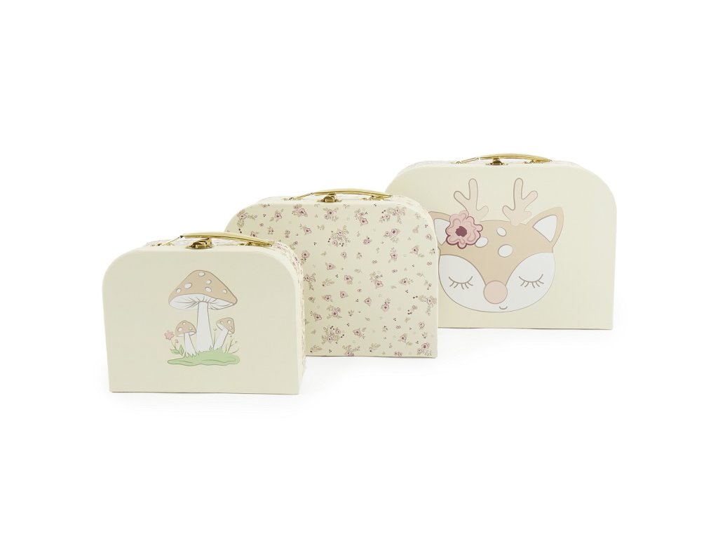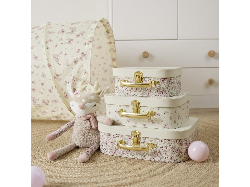 Súprava troch kartónových kufríkov je skvelým doplnkom do detskej izby aj praktickým spoločníkom na cesty. S nádhernými kvetinovými vzormi a motívom jelenčeka Elly okúzli všetkých malých dobrodruhov. Pevné kartónové kufríky majú odolnú kovovú sponu a pohodlnú rukoväť. Sú ideálne pre ukladanie detských pokladov a hračiek. Vďaka možnosti vkladať kufríky do seba sú skladné aj multifunkčné. Deti aj ich rodičia si ich zamilujú nielen pre ich krásu, ale aj užitočnosť. Kufríky možno vziať kamkoľvek so sebou na cesty. Keď idete na výlet, deti sú často zvlášť hrdé na to, že si so sebou vezmú vlastnú malú batožinu, v ktorom majú svoje obľúbené veci. Vyrobené z pevného kartónu s certifikáciou FSC. Kufríky čistite iba za sucha mäkkou handričkou. Rozmery kufríkov: malý: 20 x 15 x 8,5 cm stredný: 25 x 18 x 9 cm veľký: 30 x 21 x 9,5 cm