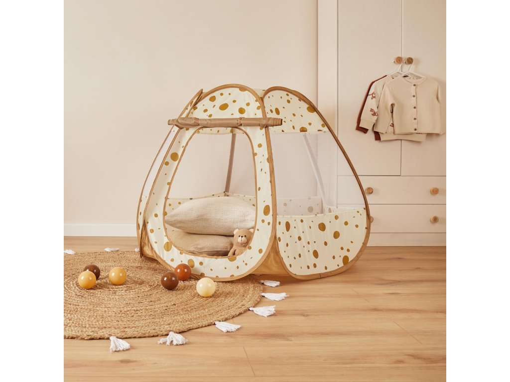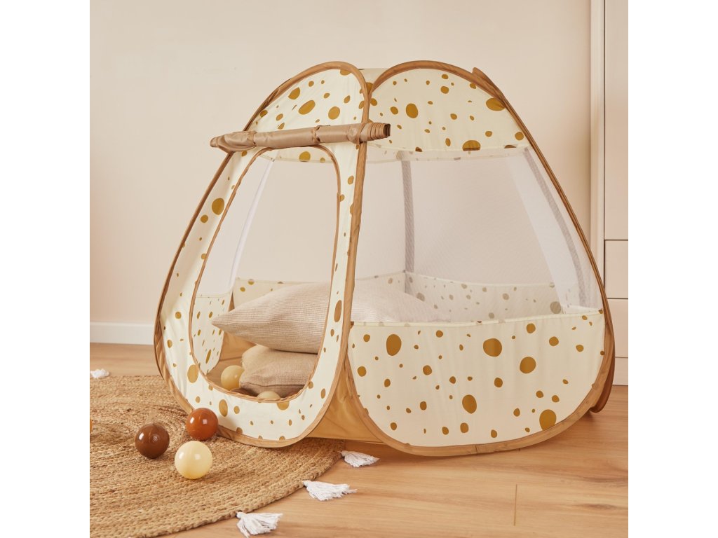 Nekonečná zábava pre malých objaviteľov! Hrací stan a loptičkový box 2v1 spája radosť z hry do jedinečného zážitku! S päťdesiatimi priloženými loptičkami si deti precvičia svoje motorické zručnosti. Rolovací vstup možno jednoducho otvoriť alebo zaistiť pomocou stúh. Stan sa vďaka praktickej pop-up konštrukcii rozloží počas niekoľkých sekúnd a tiež je ľahko skladný pre úsporu miesta. Skvelo sa hodí pre dobrodružstvá doma aj vonku! Stan je vyrobený z odolného polyesteru, ktorý sa ľahko udržuje a čistí. Kolekcia Dots v teplých karamelových tónoch premení detskú izbu na útulné a hravé miesto, kde si deti užívajú každý deň mnoho smiechu a radosti. • Materiál: polyester • Rozmer: 100 x 100 x 90 cm • Obsah balenia: 1 stan na hranie, 50 loptičiek, 1 návod na zostavenie. • Údržba: čistite vlhkou handričkou a jemným mydlom. Nemočte stan vo vode a sušte iba na vzduchu, nedávajte do sušičky. • Odporúčaný vek: odporúčame od cca 12 mesiacov, keď už vaše dieťa vie bezpečne sedieť. Pozor, montáž musí vykonávať dospelá osoba. Stan sa zdvíha extrémne rýchlo. Iba pre domáce použitie. Chráňte pred ohňom. Používajte iba pod dohľadom dospelej osoby. Zhoda s normou: EN-71-1-2-3-9. Nezávisle testované a kontrolované na škodlivé látky.