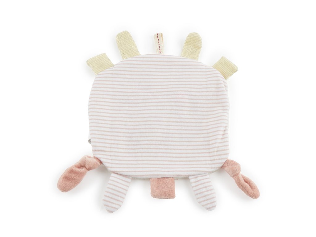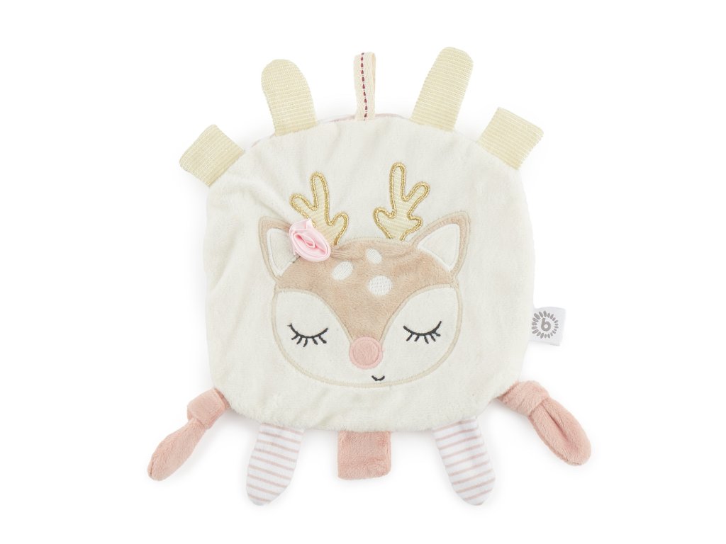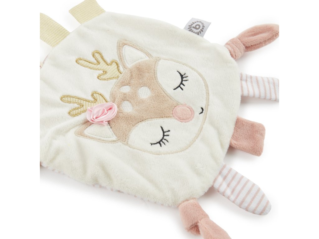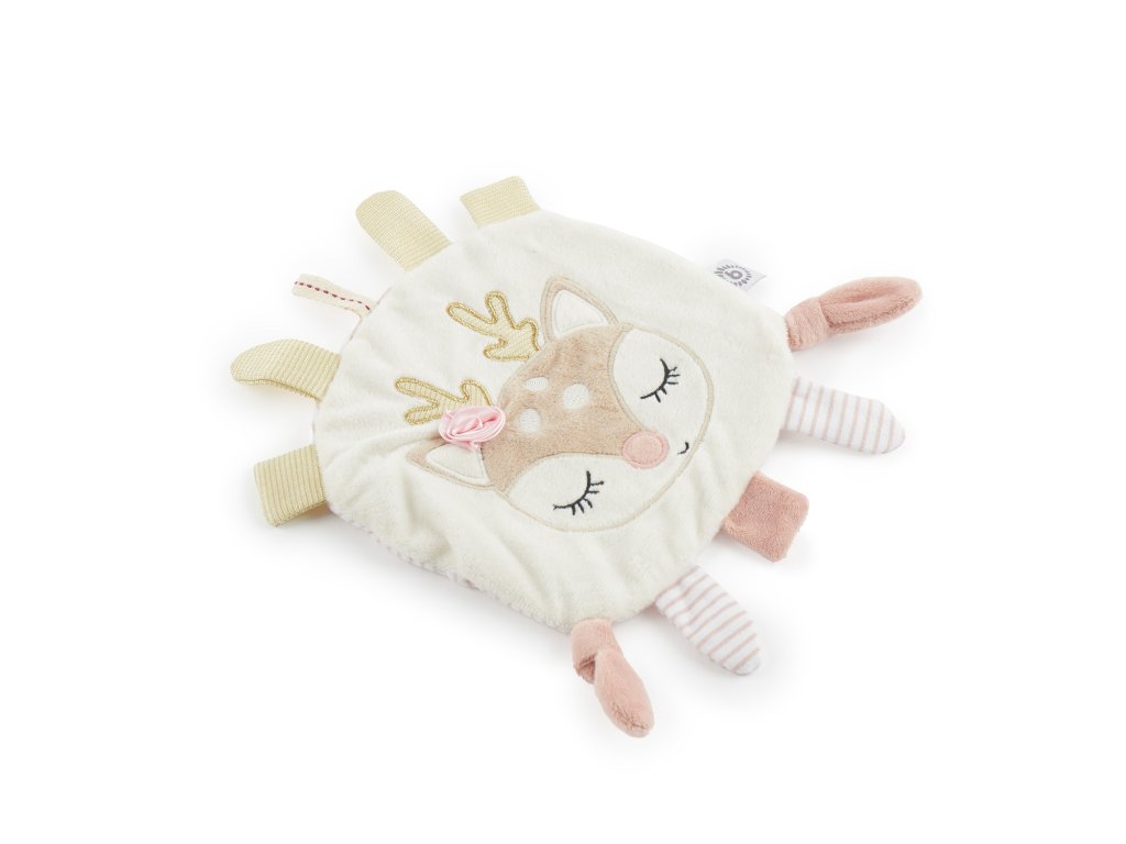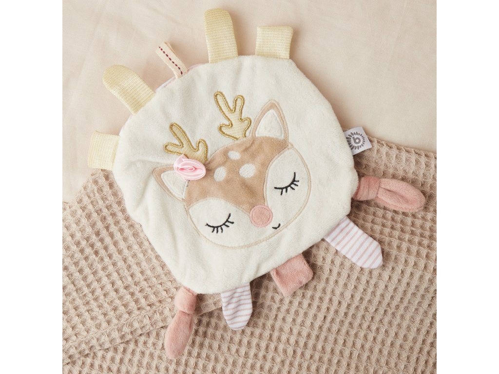 Nechajte svoje bábätko objaviť maznavého štvorcového uspávačika s motívom jelenčeka. Uspávačik v podobe jemného maznáčika sa stane skvelým spoločníkom pre vaše bábätko od prvých dní života. Hebký materiál je príjemný na dotyk a ľahko sa uchopí aj najmenšími ručičkami. Rôzne textúry a šuštivá fólia vo vnútri stimulujú zmysly a podporujú skúmanie sveta. Deti ocenia množstvo visačiek a uzlíkov, ktoré môžu ťahať, ochutnávať a preskúmavať. Jemné farby dodávajú uspávačiku štýl, vďaka čomu poteší nielen deti, ale aj rodičov. Uľahčuje zaspávanie a navodzuje pocit bezpečia. • Materiál: polyester • Rozmery: 36 x 28 x 3 cm • Odporúčaný vek: od 0 mesiacov • Ľahká údržba: ručné pranie