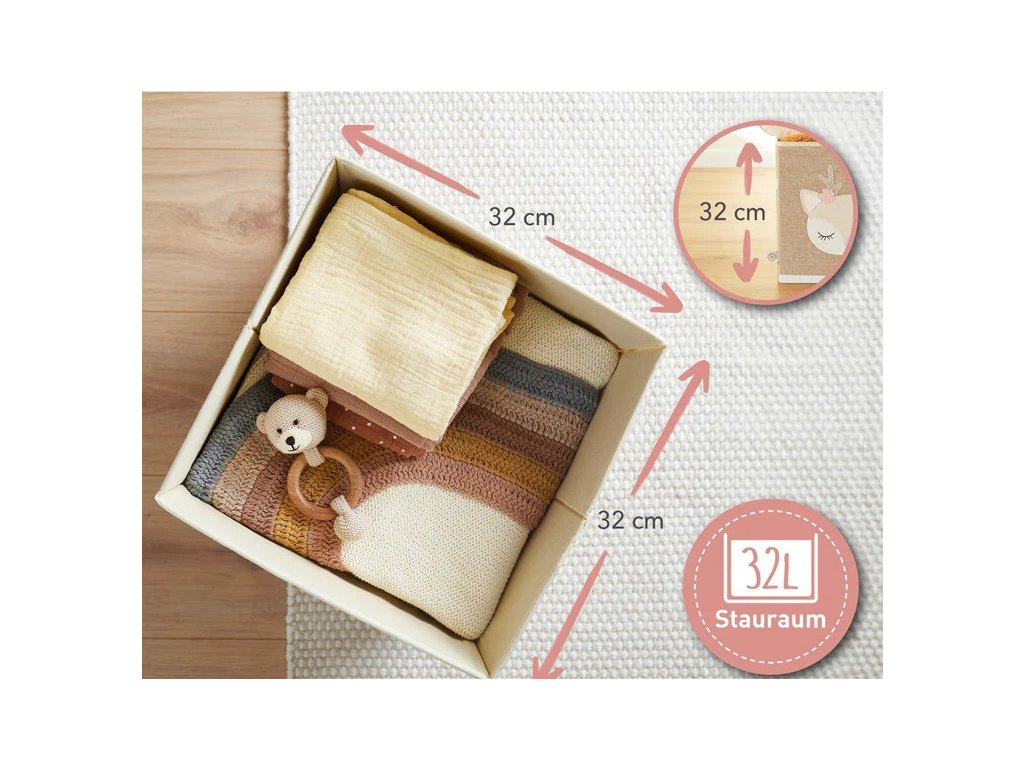 Vneste do detskej izby poriadok s týmto krásnym úložným boxom! Dekoratívny box je štvorcový a možno ho ľahko použiť ako priehradku na policu IKEA Kallax. Praktické úchyty na bokoch umožňujú ľahké prenášanie. Pokiaľ ho práve nepotrebujete, jednoducho ho zložíte a uschováte. S kapacitou okolo 33 litrov ponúka tento úložný box množstvo miesta pre obľúbené hračky, oblečenie a ďalšie veci. Čistite vlhkou handričkou a jemným mydlom a potom nechajte sušiť na vzduchu. Neponárajte do vody. • Materiál: vonkajší: polyester v ľanovom vzhľade, plsť, vo vnútri: polyester, kartón • Rozmery: 32 x 32 x 32 cmDodatočné parametre