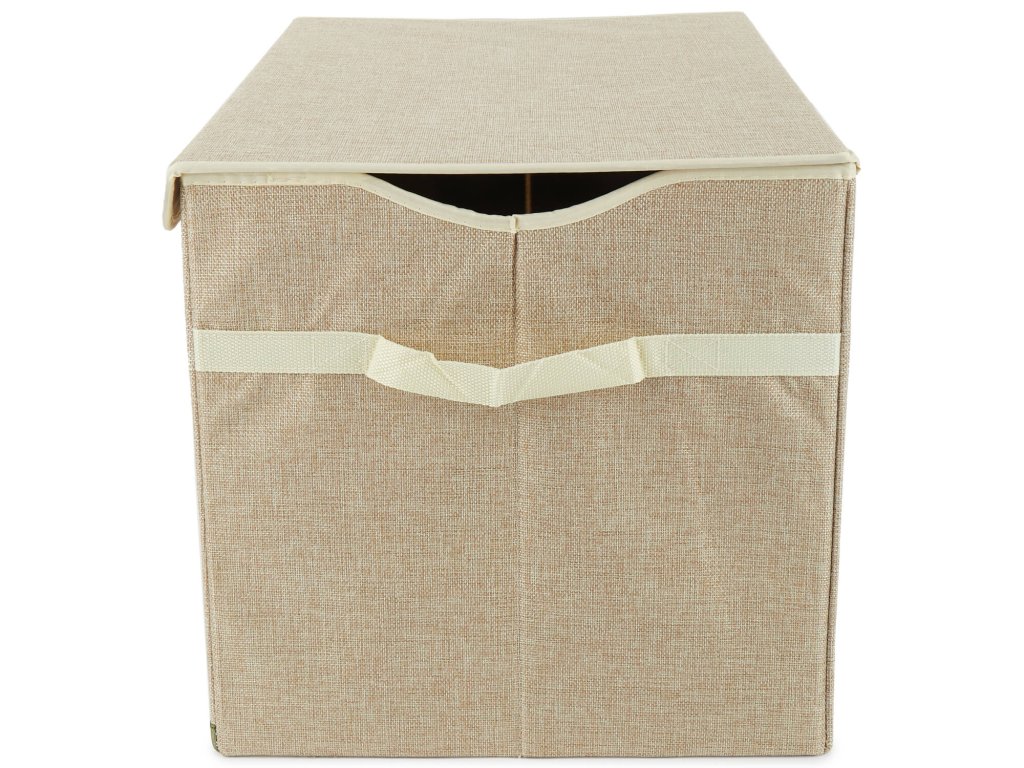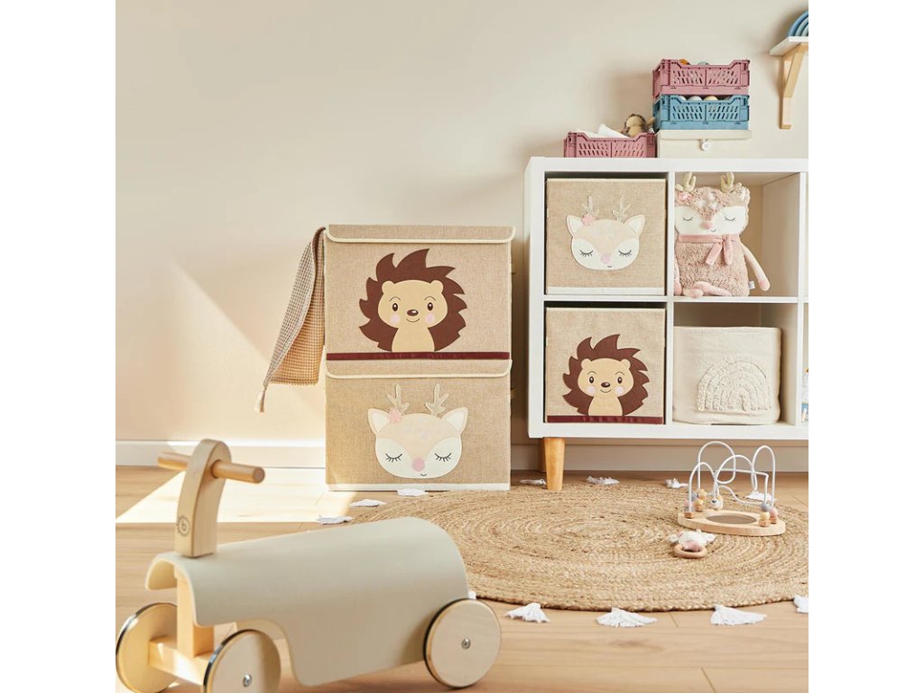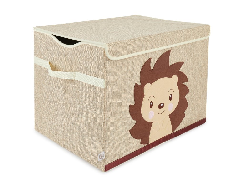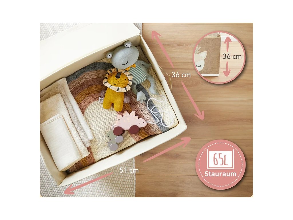 Krásny úložný box na hračky prináša poriadok do detskej izby. Je tak priestorný, že zabudnete na chaos! Dekoratívny box má odklápacie veko so suchým zipsom. Pokiaľ box nie je potrebný, možno ho jednoducho zložiť a uložiť v skrini. Po stranách má box úchyty, možno ho tak ľahko prenášať. S kapacitou okolo 65 litrov ponúka tento úložný box dostatok priestoru pre obľúbené hračky, oblečenie a ďalšie veci. Čistite vlhkou handričkou a jemným mydlom a potom nechajte sušiť na vzduchu. Neponárajte do vody. Materiál: vonkajší: polyester v ľanovom vzhľade, plsť, vnútorný: polyester, kartón Rozmery: 36 x 36 x 51 cm Nezávisle testované a kontrolované na škodlivé látky.Dodatočné parametre