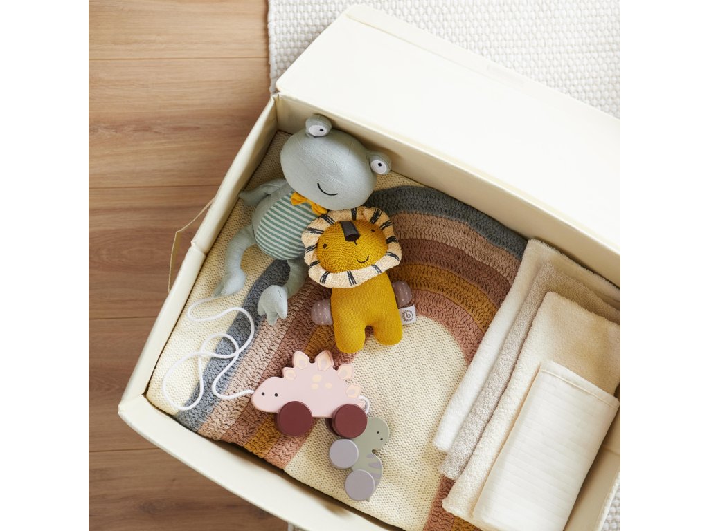 Krásny úložný box na hračky prináša poriadok do detskej izby. Je tak priestorný, že zabudnete na chaos! Dekoratívny box má odklápacie veko so suchým zipsom. Pokiaľ box nie je potrebný, možno ho jednoducho zložiť a uložiť v skrini. Po stranách má box úchyty, možno ho tak ľahko prenášať. S kapacitou okolo 65 litrov ponúka tento úložný box dostatok priestoru pre obľúbené hračky, oblečenie a ďalšie veci. Čistite vlhkou handričkou a jemným mydlom a potom nechajte sušiť na vzduchu. Neponárajte do vody. Materiál: vonkajší: polyester v ľanovom vzhľade, plsť, vnútorný: polyester, kartón Rozmery: 36 x 36 x 51 cm Nezávisle testované a kontrolované na škodlivé látky.Dodatočné parametre