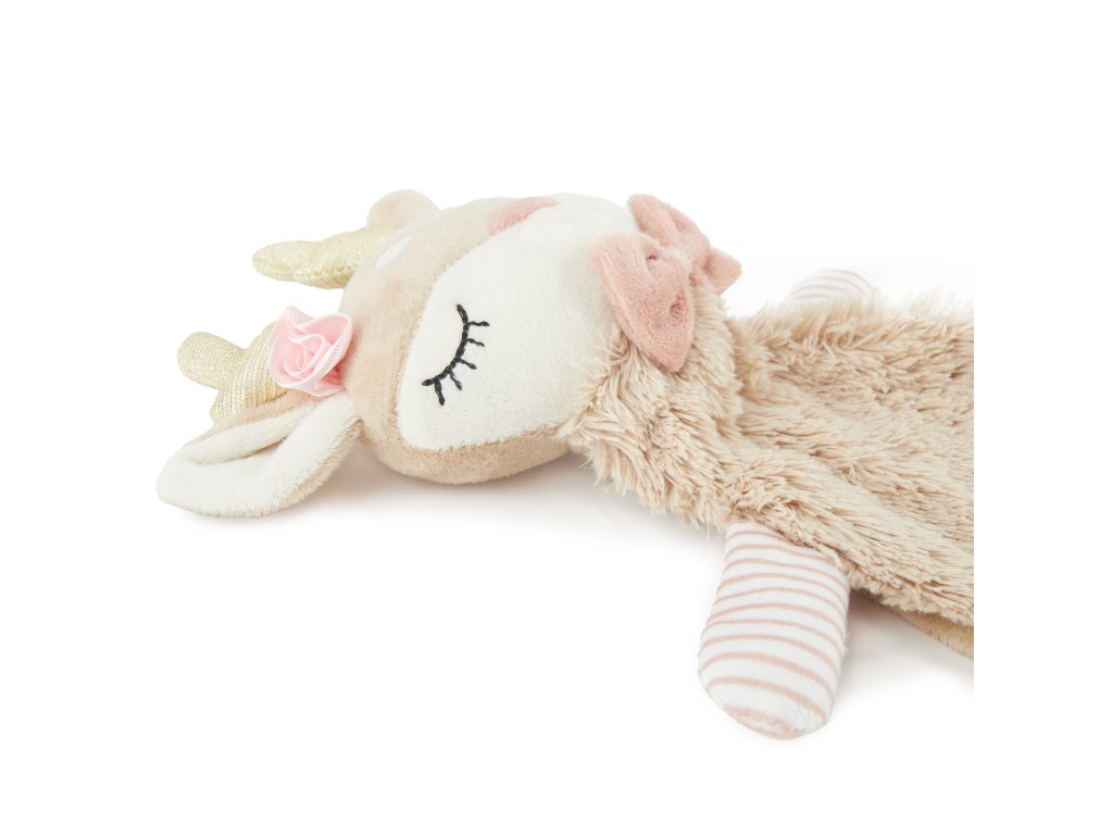 Nechajte svoje bábätko objaviť najlepšieho maznavého kamaráta! Jelenček Ella v podobe jemného maznáčika je skvelým spoločníkom pre vaše bábätko od prvých dní života. Zamatovo hebký materiál dodáva pocit bezpečia a tepla, zatiaľ čo roztomilý dizajn ponúka mnoho podnetov na uchopenie, čím podporuje jemnú motoriku. Vďaka svojej praktickej veľkosti sa ľahko drží i najmenšími ručičkami. Ella pomáha bábätkám ľahšie zaspávať, poskytuje pocit pokoja a bezpečia a stáva sa obľúbeným maznáčikom do postieľky – verným spoločníkom doma i na cestách. • Materiál: polyester • Rozmery: 36 x 28 x 3 cm • Odporúčaný vek: od narodenia