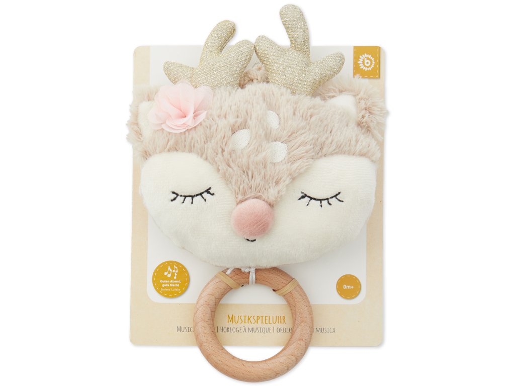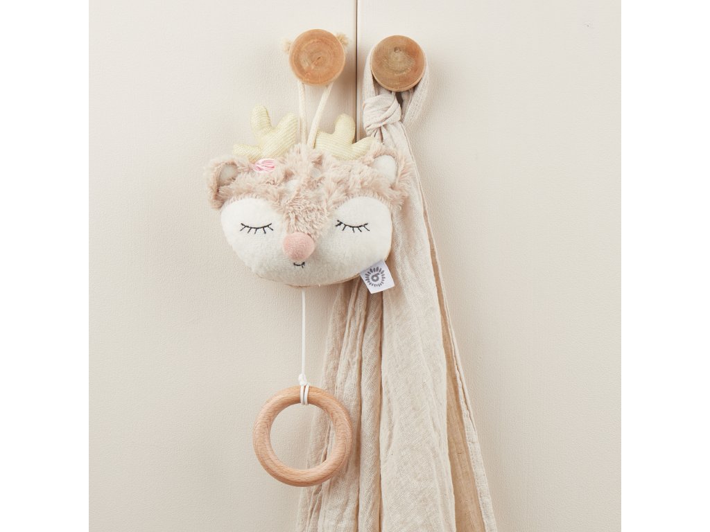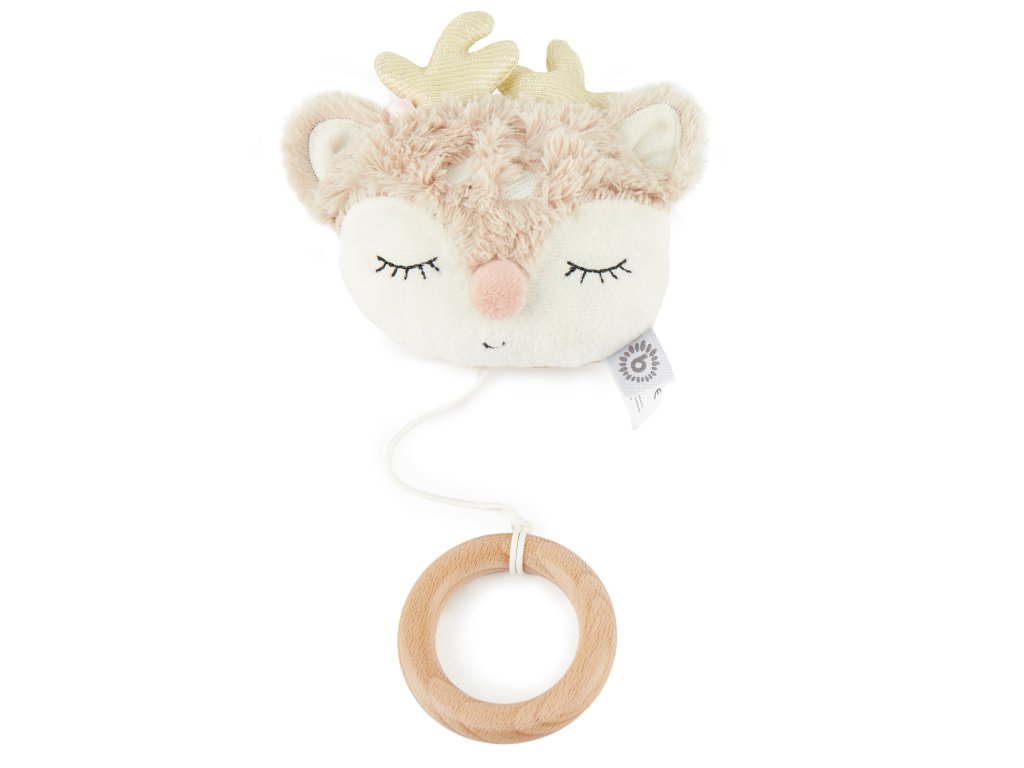 Pomôžte svojmu bábätku nájsť pokojný spánok a ukolísať sa v príjemných snoch s hudobnou hračkou v tvare jelenčeka Elly. Táto hebká a nežná hračka hrá nádhernú melódiu Brahmsovej uspávanky „Dobrý večer, dobrú noc“. Hračka pomáha vytvoriť upokojujúcu atmosféru v postieľke pri zaspávaní. Jemný dizajn je príjemný na dotyk i uchopenie, zatiaľ čo praktické povrázky umožňujú ľahké pripevnenie k postieľke, kočíku alebo autosedačke. Drevený krúžok slúži na ľahké natiahnutie hudobného strojčeka. • Materiál: polyester • Rozmery: 33 x 16 x 5 cm • Návod na starostlivosť: neperte, otrite iba vlhkou handričkou • Odporúčaný vek: od 0 mesiacov Pozor, používajte iba pod dohľadom dospelej osoby. Zhoda s normou: EN-71-1-2-3-9. Nezávisle testované a kontrolované na škodlivé látky.