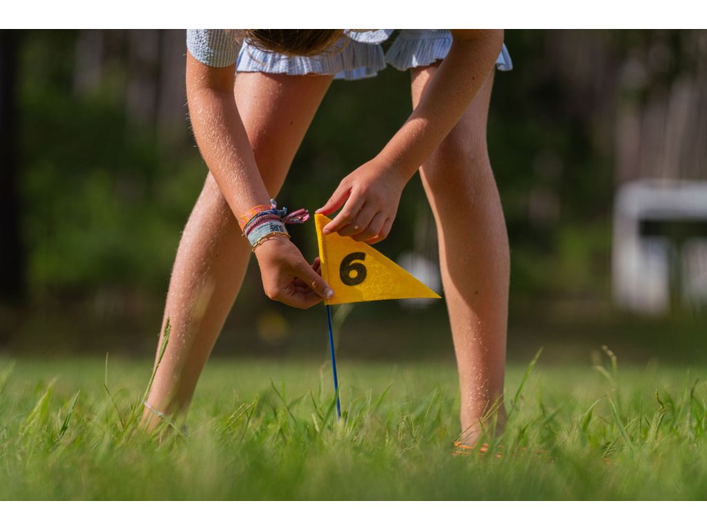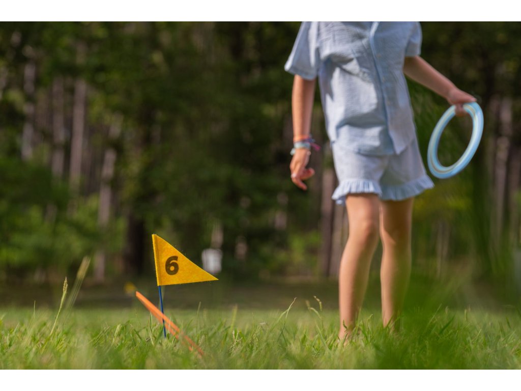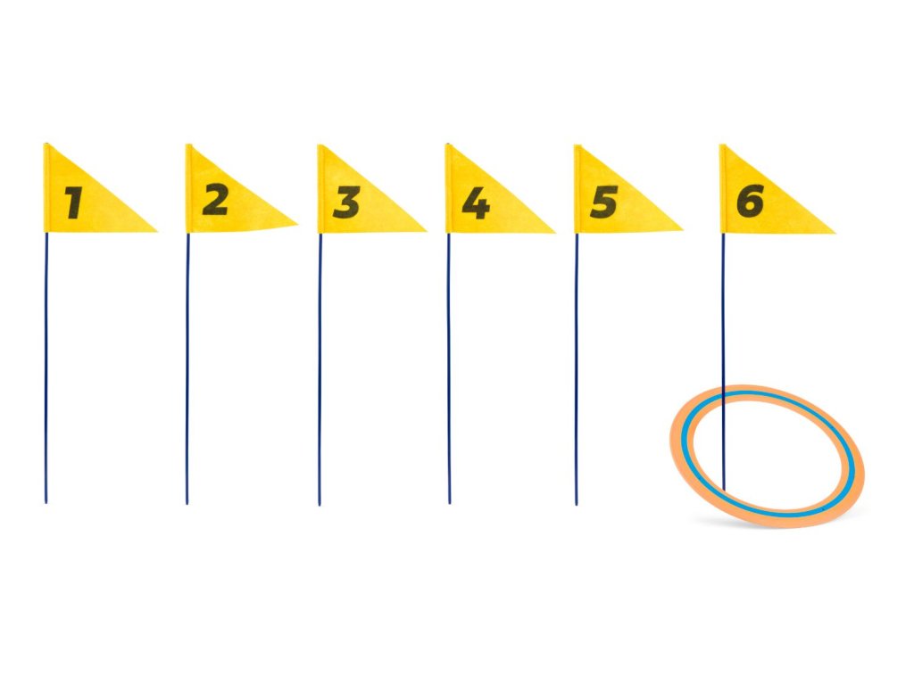 Hra do prírody pre 1 až 3 hráčov od 6 rokov. Užite si hodiny vonkajšej zábavy s touto zábavnou hrou! Hádžte disky na očíslované vlajky a zbierajte body. Víťazí hráč, ktorý ako prvý trafí všetkých 6 tyčí v správnom poradí. Hra má viac rôznych variantov.