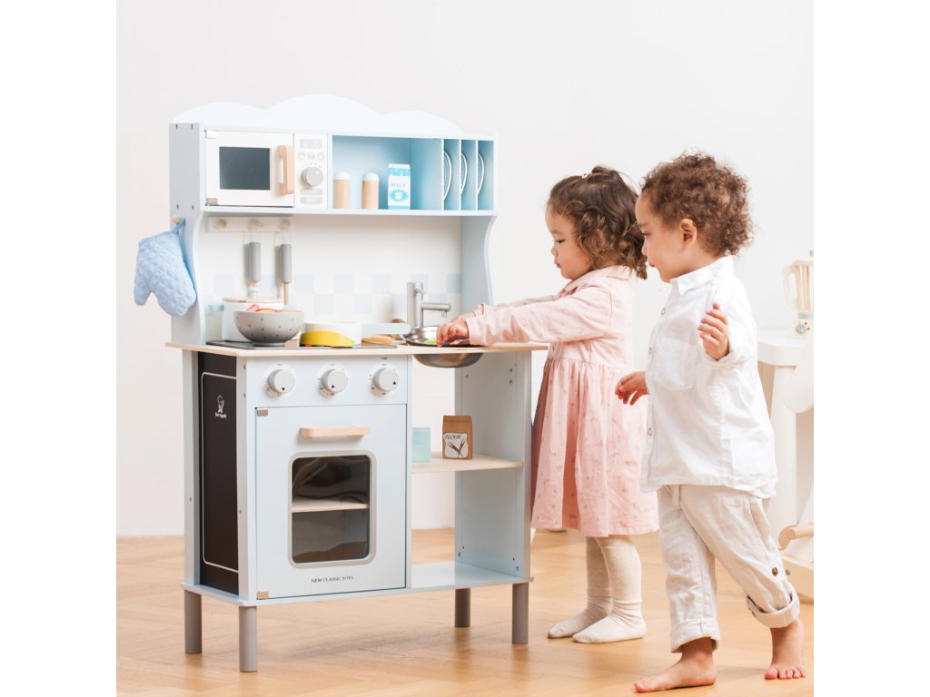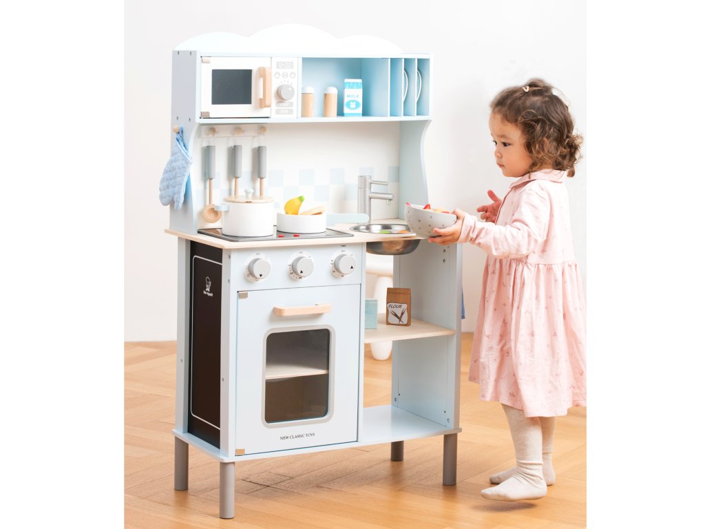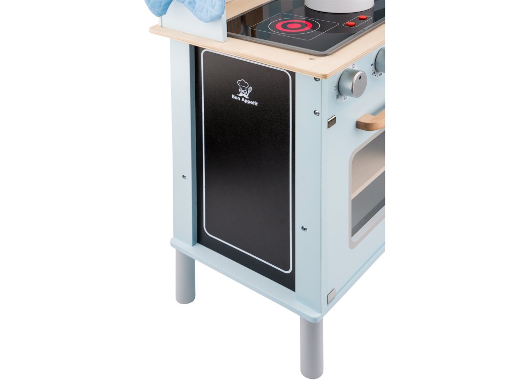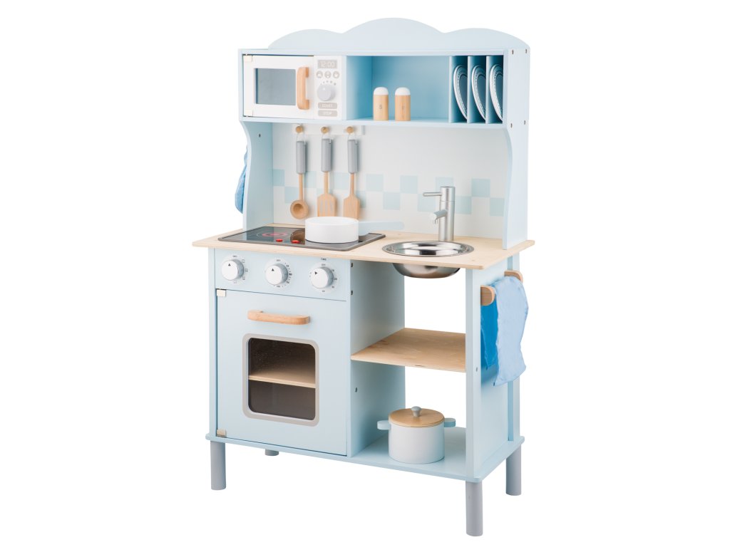 Okúzľujúca moderná kuchynka pre deti od 3 rokov. Ideálna pre malých kuchárov, ktorých lákajú kulinárske dobrodružstvá. Kuchynka je vybavená rúrou na pečenie a mikrovlnkou na ohrievanie lahodných pokrmov. Umývadlo s kohútikom dodáva realistický herný zážitok. V súprave nájdete tiež 3 drevené kuchynské nástroje, chňapku, utierku, soľničku, koreničku a dva hrnce s pokrievkou – všetko, čo malí kuchári potrebujú na prípravu lahodných jedál. Deti si tak môžu vyskúšať varenie, miešanie, pečenie a dokonca aj umývanie riadu, čo podporuje nielen hru rol, ale tiež jemnú motoriku, fantáziu a koordináciu. Parametre: výška pracovnej dosky je 55 cm, • rozmery kuchynky sú 600 x 300 x 1000 mm.