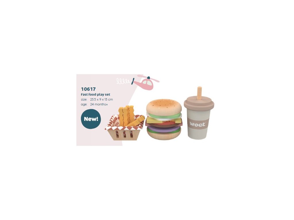 Drevená súprava rýchleho občerstvenia so všetkým, čo potrebujete na vytvorenie a servírovanie vlastného hamburger menu. Súprava obsahuje hamburger s ingredienciami, ktoré si deti môžu postaviť na seba, košík hranolčekov a drevený mliečny kokteil so slamkou. Skladanie dielov pomáha rozvíjať jemnú motoriku a koordináciu rúk a očí. Drevo pochádza zo zodpovedne obhospodarovaných lesov. Súprava je vhodná pre deti od 3 rokov. Podporuje hru rol, motoriku a fantáziu.Dodatočné parametre