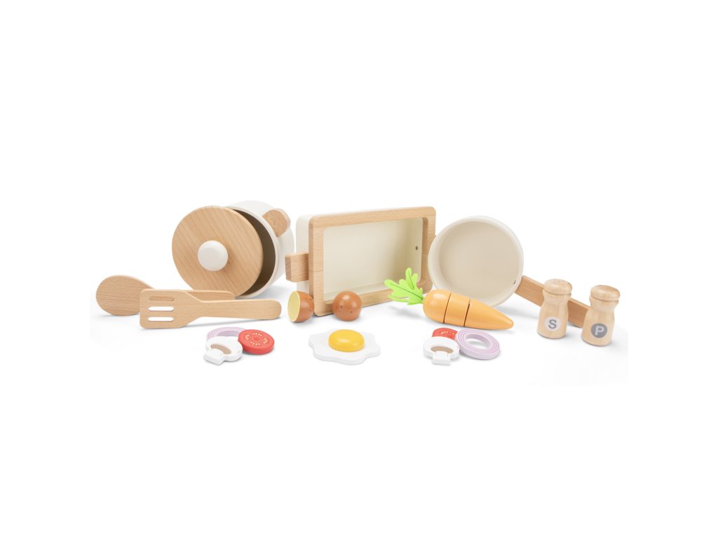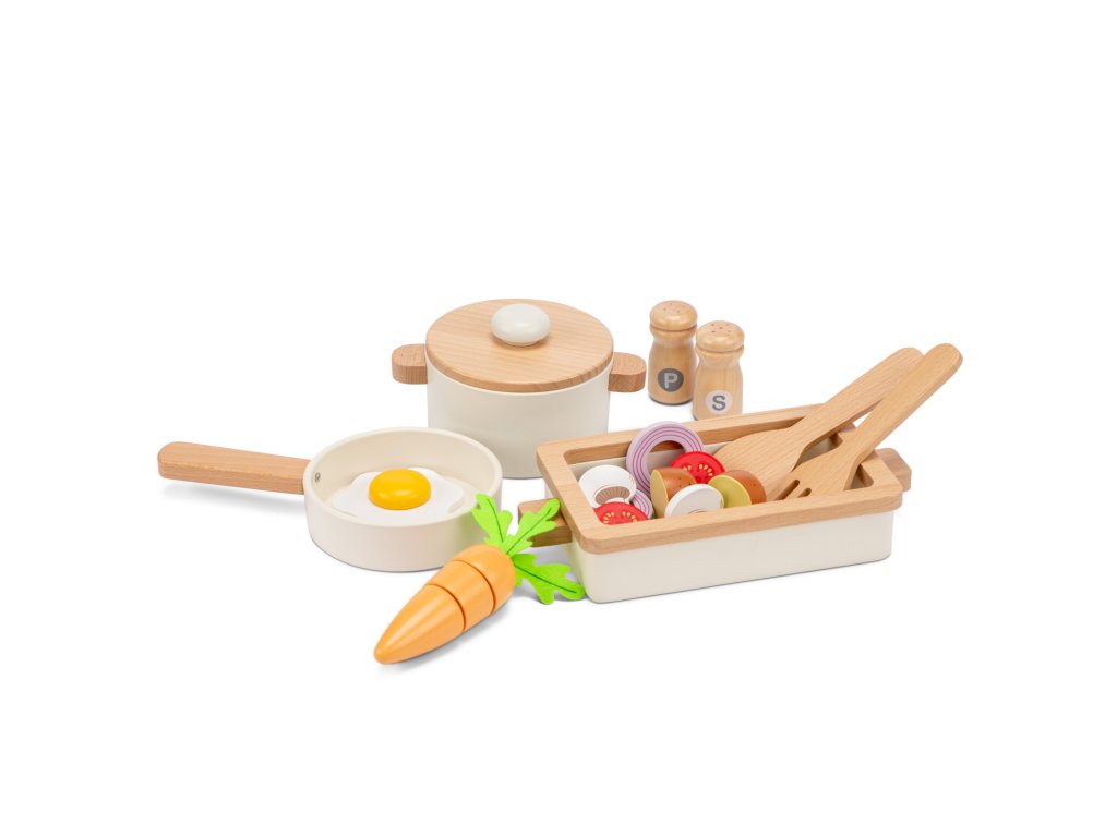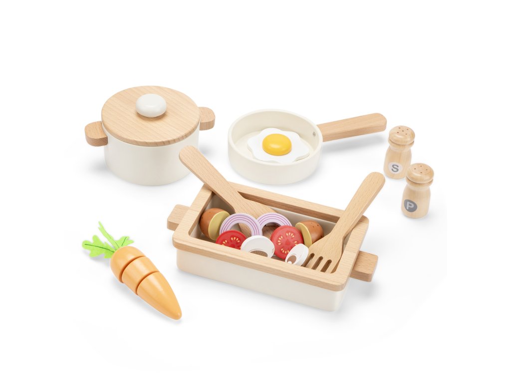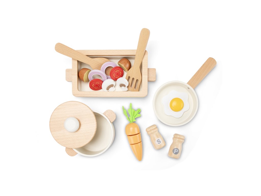 Pripravte si vlastnú hostinu! S touto krásnou drevenou súpravou riadu sa deti od 2 rokov premenia na malých šéfkuchárov. V súprave nájdu panvicu, hrniec s pokrievkou, dve varešky, soľničku a koreničku, mrkvu, ktorú môžu rozkrojiť na tri časti vďaka suchému zipsu, a ďalšie farebné ingrediencie na varenie. Deti môžu miešať, krájať, soliť aj servírovať – presne tak, ako to robia dospelí. Hra podporuje hru rol, rozvíja fantáziu a jemnú motoriku. Nech už deti pripravujú polievku pre plyšiaky, alebo špeciálne menu pre celú rodinu, vždy zažijú množstvo zábavy a radosti. Táto súprava je vyrobená z dreva, takže je nielen krásna, ale i odolná. Perfektný doplnok do každej detskej kuchynky!Dodatočné parametre