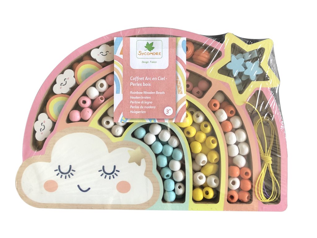 Drevené pastelové koráliky uložené v krabičke v tvare dúhy sú krásny darček pre deti od 3 rokov. Navliekanie korálikov napomáha rozvoju jemnej motoriky, koordinácie ruky a oka a navyše vyžaduje trpezlivosť a sústredenie sa na danú vec. V atraktívnom balení nájdete viac než 180 ks drevených korálikov, 2 prívesky s dúhou a 3 metre povrázku. Rozmery balenia sú 15 x 22,5 x 2 cm.Dodatočné parametre