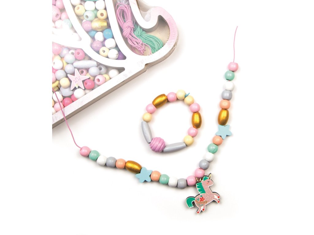 Drevené koráliky uložené v škatuľke v tvare jednorožca sú krásny darček pre deti od 4 rokov. Navliekanie korálikov je zábavná a pútavá aktivita, ktorá napomáha rozvoju jemnej motoriky, koordinácii ruky a oka a navyše vyžaduje trpezlivosť a sústredenie sa na danú vec. Krásna škatuľka poslúži zároveň ako šperkovnica na hotové výrobky.