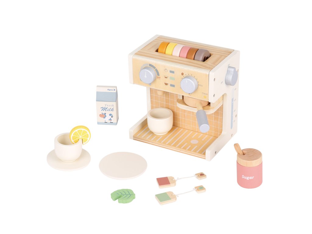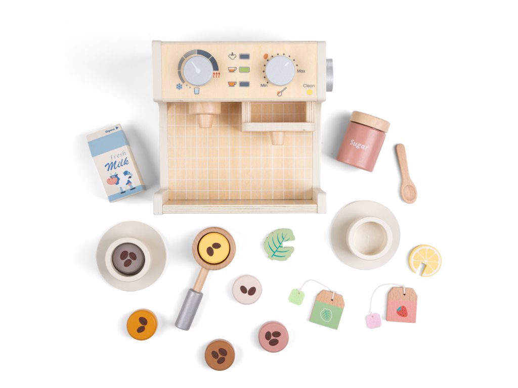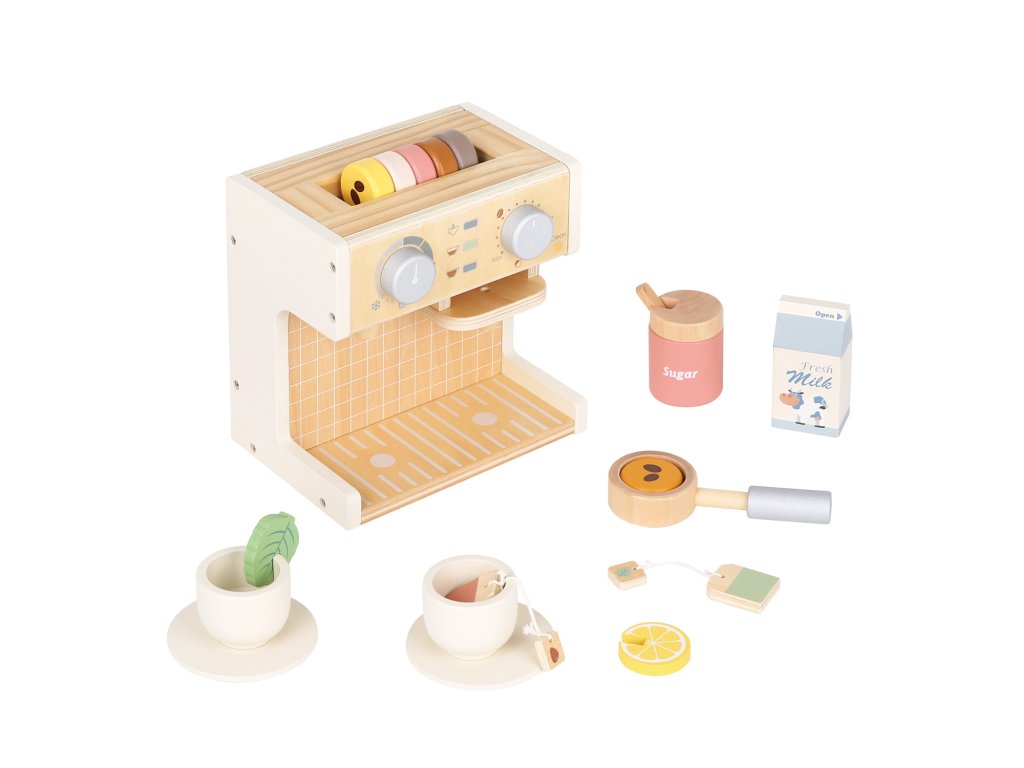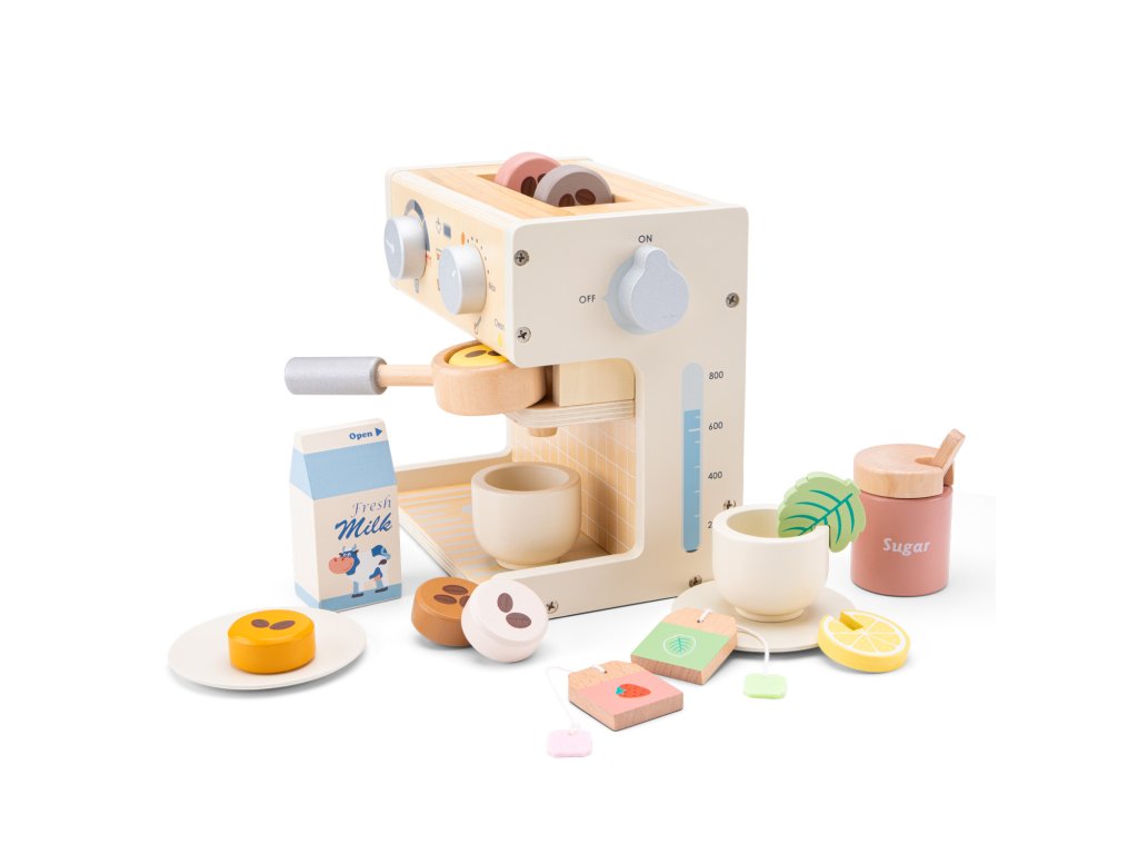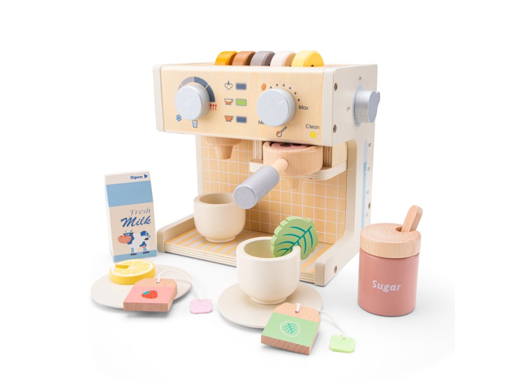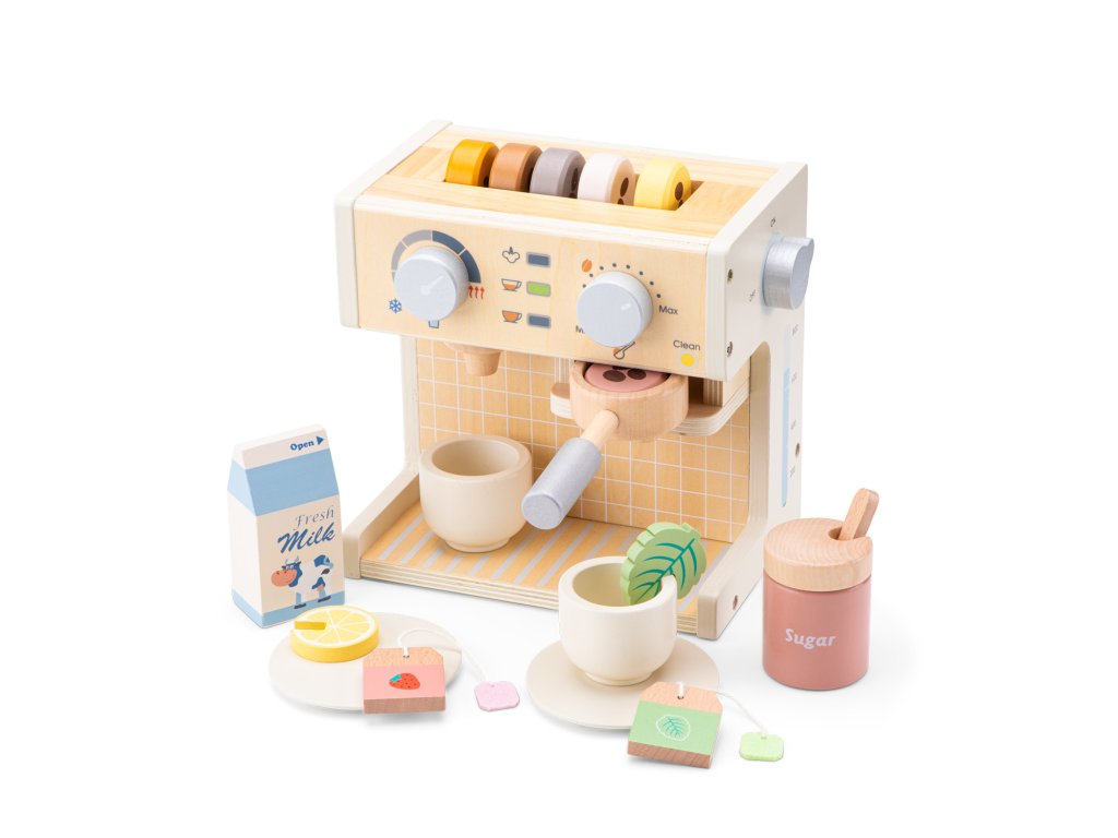 Dáte si šálku dobrej kávy alebo lahodný čaj? Drevený kávovar je dokonalým doplnkom každej detskej kuchynky pre deti od 3 rokov a prináša do hry nielen zábavu, ale aj priestor pre učenie a rozvoj zručností. Deti môžu predstierať servírovanie kávy alebo čaju svojim plyšiakom, rodičom alebo kamarátom, čo podporuje ich sociálne zručnosti. Súprava obsahuje pestrú škálu príslušenstva. 6 rôznych farebných kávových kapsúl, 2 čajové vrecúška, lístok mäty, plátok citróna, cukorničku, džbán na mlieko a dve šálky s podšálkami. Deti si pri hre nielen rozvíjajú motorické zručnosti, ale tiež kreativitu a schopnosť komunikácie. Hra s kávovarom je ideálnou príležitosťou na precvičovanie koordinácie ruky a oka a nápadité hranie rol. Vyrobené z ekologického dreva s certifikáciou FSC. Táto drevená hračka ponúka hodiny zábavy a zároveň podporuje učenie zábavnou formou. Vhodné pre deti od 3 rokov. Parametre: • rozmery: 185 x 120 x 173 mm.
