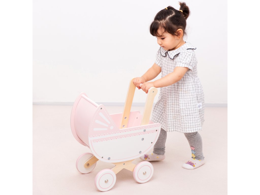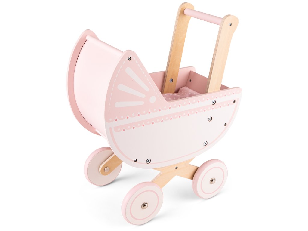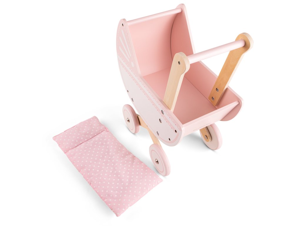 Drevený kočík pre bábiky vrátane perinky a vankúšika - ružový