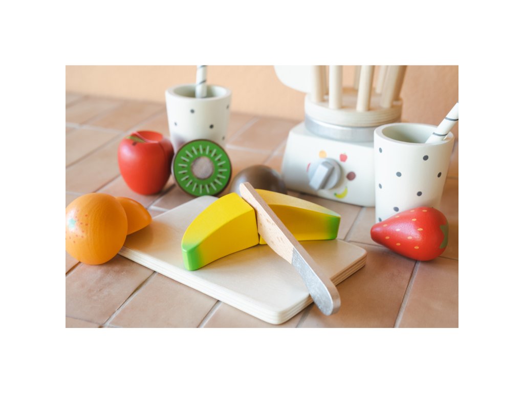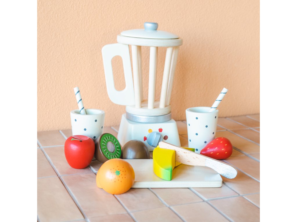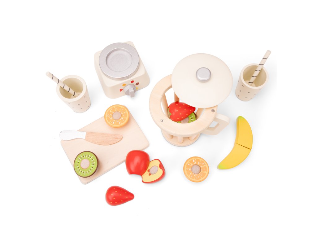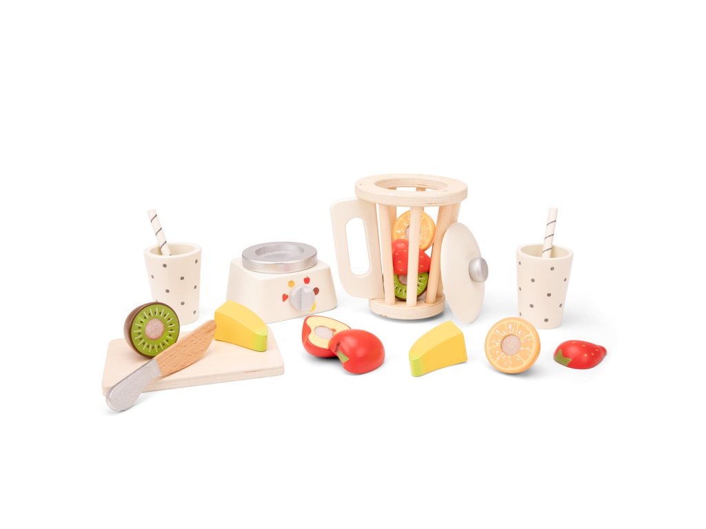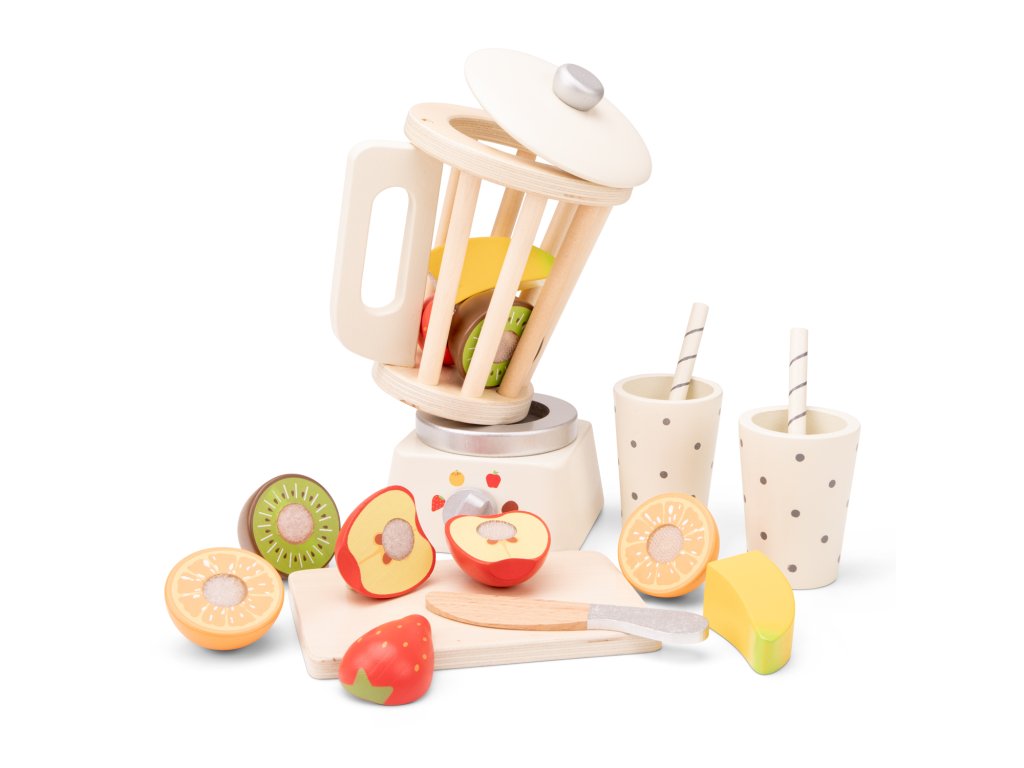 Drevený mixér na smoothie je skvelým doplnkom každej detskej kuchynky a prináša zábavu i učenie v jednom. S touto hračkou sa deti môžu hrať na prípravu zdravých smoothies, čo podnecuje ich kreativitu a zároveň rozvíja jemnú motoriku. Drevený mixér má otočný gombík a odnímateľné veko, čo deťom umožňuje napodobňovať skutočné mixovanie. Súprava obsahuje päť druhov dreveného ovocia – banán, jahodu, jablko, pomaranč a kivi. Každé ovocie je rozdelené na dva kusy a spojené suchým zipsom, vďaka čomu ich deti ľahko „rozporcujú“ na priloženej doštičke pomocou hracieho noža. Nechýbajú ani dva tégliky so slamkami pre servírovanie chutných výtvorov. Hračka podporuje detskú predstavivosť a sociálne zručnosti, pretože pri hraní rol sa deti učia spolupracovať a komunikovať. Táto hračka ponúka skvelý spôsob, ako deti naučiť zdravým návykom, rozvíjať ich schopnosti a ešte k tomu si užiť hodiny tvorivej zábavy. Vhodné pre deti od 3 rokov. Parametre: • rozmery: 130 x 110 x 220 mm.