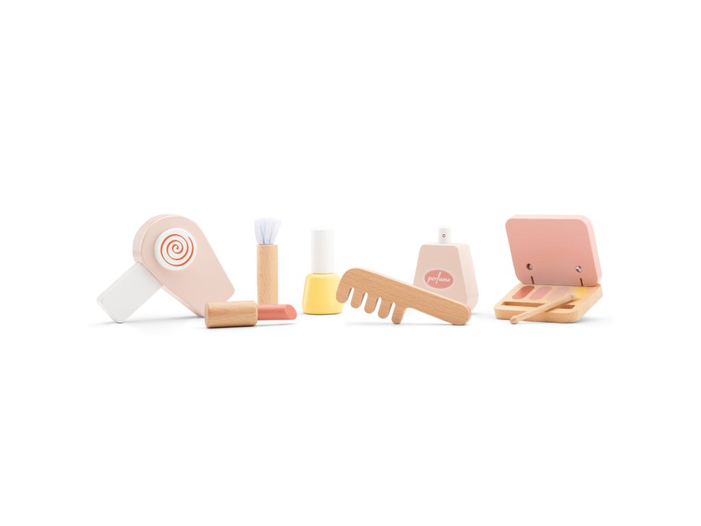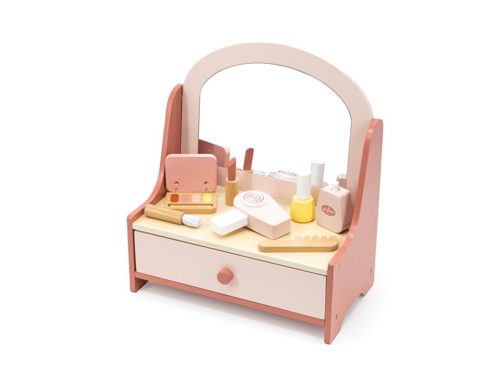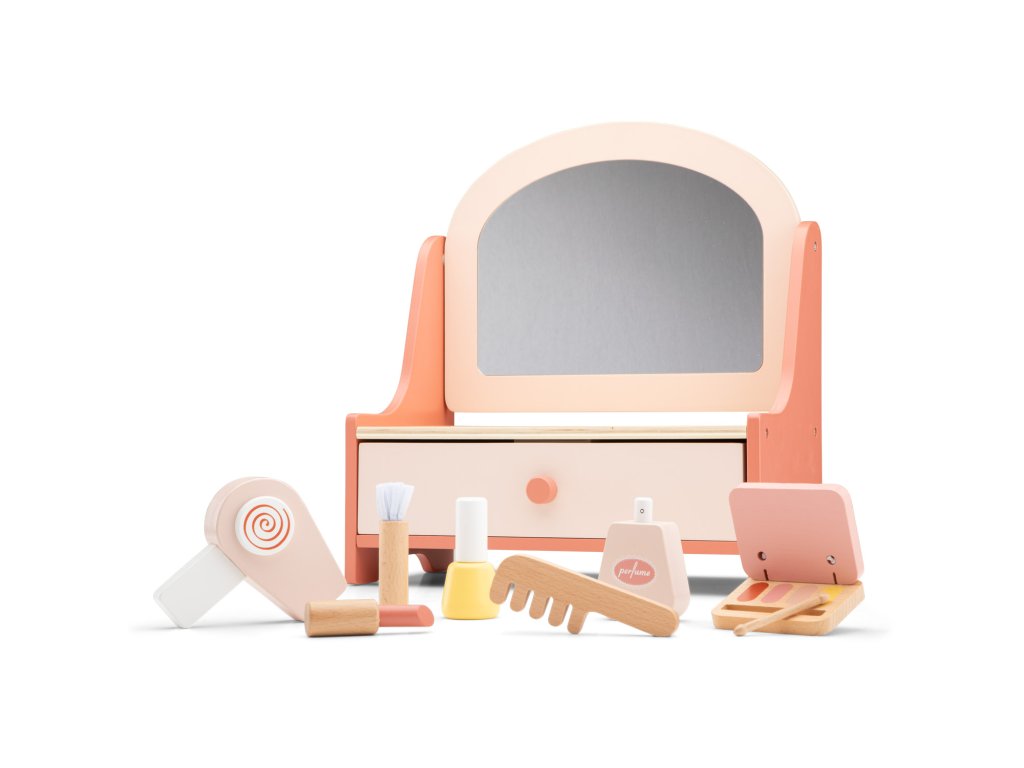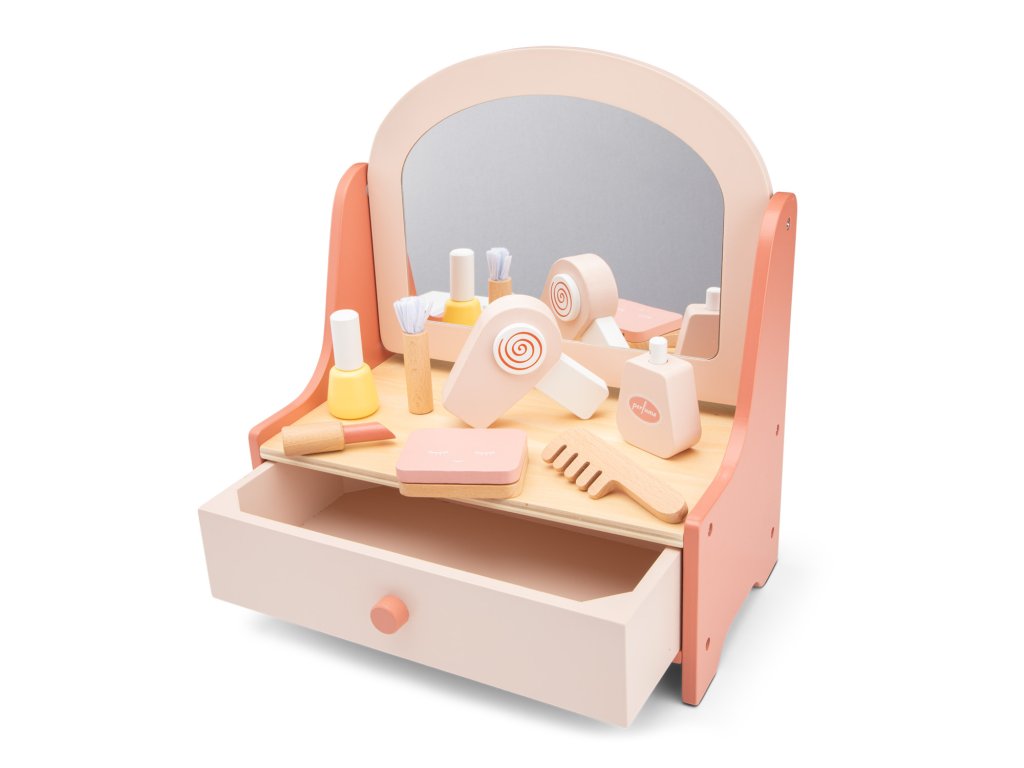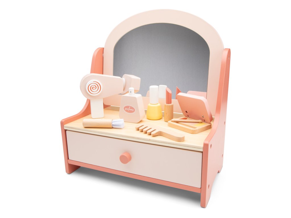 Krásny drevený kozmetický stolček, ktorý povzbudí kreativitu a nápaditú hru vašich detí. Tento elegantný toaletný stolček s otočným zrkadlom ponúka malej princeznej všetko, čo potrebuje na to, aby mohla napodobňovať mamičku pri líčení a úprave vlasov. Súprava obsahuje 7 kozmetických produktov – kefu na vlasy, rúž, fľaštičku parfumu, fén, lak na nechty, paletku očných tieňov a štetec. Praktická zásuvka umožňuje ľahké usporiadanie všetkého príslušenstva, takže po hre zostane všetko upratané a pripravené na ďalšie použitie. Tento toaletný stolček je ideálny doplnok každej detskej izbičky. Každej malej parádnici prinesie množstvo radosti a nekonečné hodiny kreatívnej zábavy. Skvelá voľba pre deti od 3 rokov! Vyrobené zo 100 % certifikovaného dreva FSC. Parametre: rozmery sú: 320 x 180 x 370 mm.