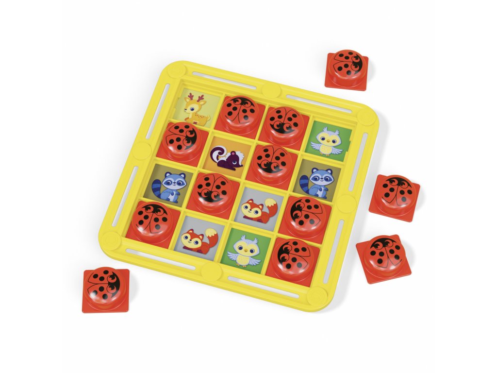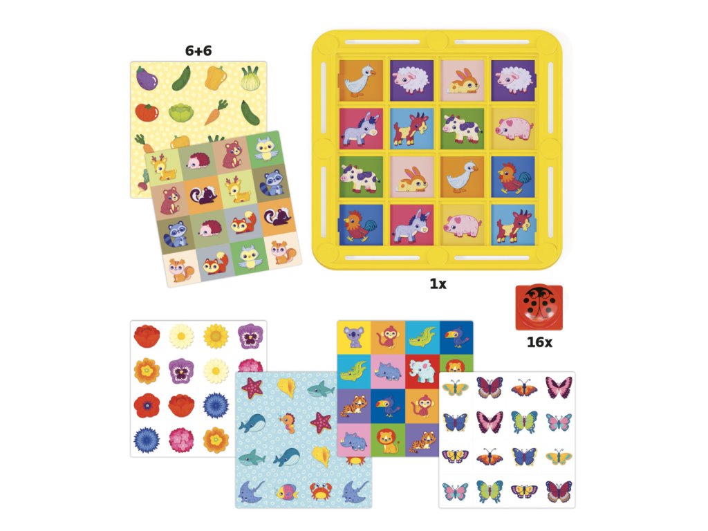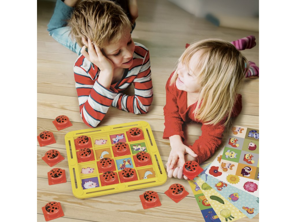 Obsah balenia: 1 žltá mriežka, 16 červených krycích žetónov s motívom lienky, 6 obojstranných ilustrovaných kariet.