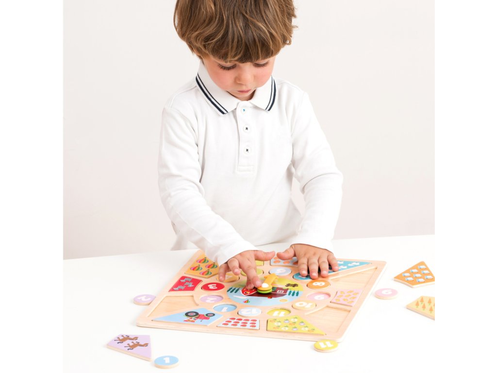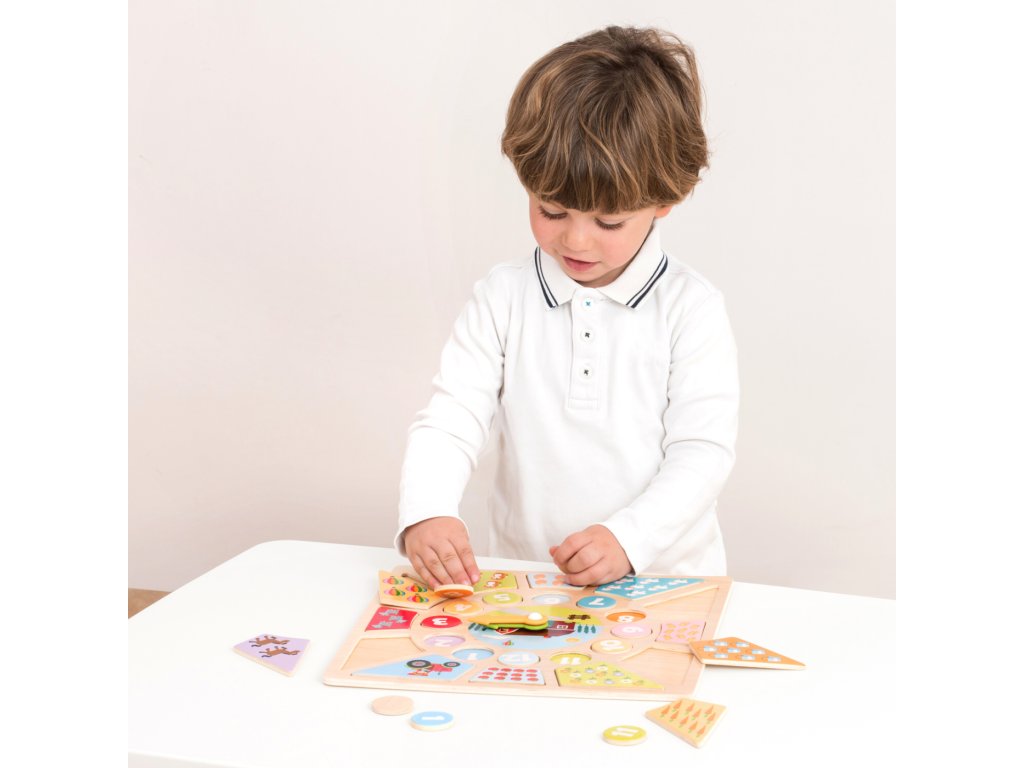 Zábavná vzdelávacia hračka pre deti od 2 rokov. Hodiny obsahujú 24 vkladacích blokov. Na každom sú obrázky v určitom počte a úlohou detí je obrázky spočítať a priradiť ku správnej číslici. Čísla hodín sú v rovnakej farbe ako príslušný dielik vkladačky. Ručičky na hodinách sú pohyblivé, staršie deti sa tak naučia hravou formou spoznávať čas. Rozmery hračky sú 300 x 300 x 20 mm.