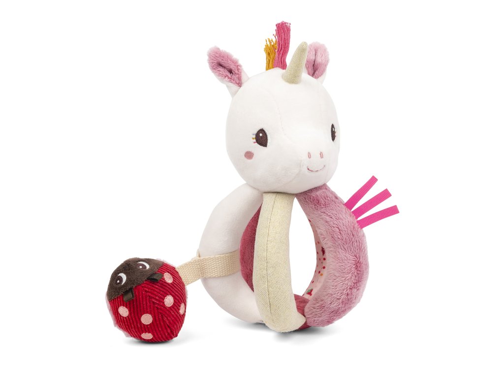 Originálna mäkučká hrkálka, ktorú malé detské ručičky ľahko uchopia. Jednorožec Lena starostlivo stráži svoju kamarátku lienku. Hrkálka ponúka deťom mix rôznych textúr a aktivít na objavovanie. Zvuk zašitej rolničky, šuštiaci papier, schovaná malá lienka. Možno prať v práčke na 30 °C na jemný cyklus.