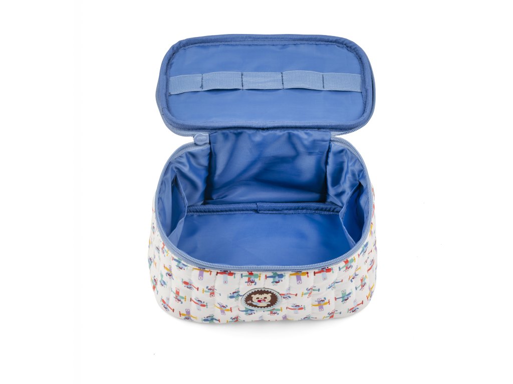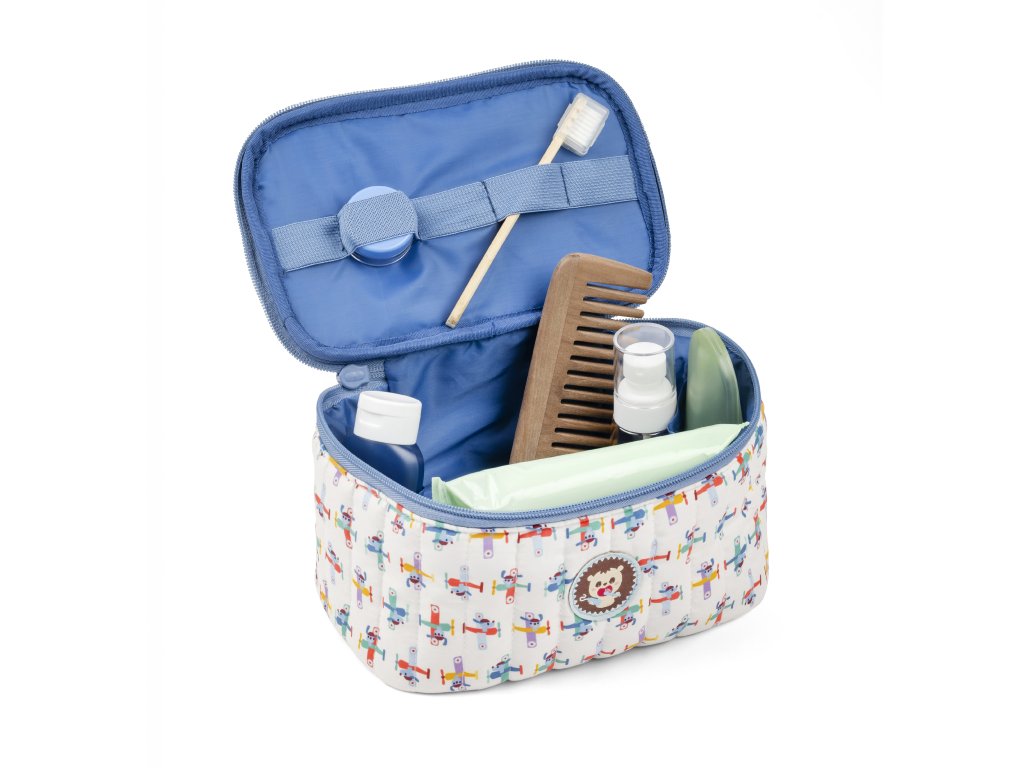 Táto detská toaletná taštička je vhodná pre deti od 2 rokov a očarí svojou trendy modrou farbou a potlačou lietadiel. Je vyrobená z mäkkého a odolného polyesteru. Široký zips ponúka rýchly prístup k obsahu: každé dieťa si svoje toaletné potreby ľahko nájde. Dve vnútorné bočné vrecká a elastické pásiky hore zaručujú skvelú organizáciu: zubné kefky, sponky do vlasov, krémy a tuby všetkých veľkostí majú svoje miesto. S rozmermi 21 x 14 x 13 cm sa táto malá toaletná taštička ľahko vojde do cestovnej tašky alebo kufra na dovolenku. Ľahko sa udržuje a možno ju prať v práčke na 30 °C na jemný cyklus. Je kompatibilná a ladí s cestovnou taškou psík Jules, takže si môžete vytvoriť zladenú súpravu na všetky cesty!