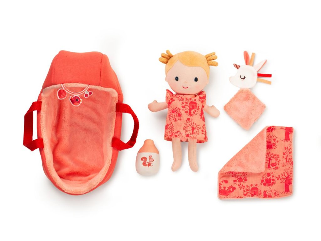 Bábika Lena sa už veľmi teší na svoju malú mamičku, ktorá ju nakŕmi, prebalí, uspí v útulnej postieľke a vezme si ju všade so sebou. Je bábika Lena smädná? Mamička sa o ňu určite s láskou postará a dá jej napiť mliečka. Súprava obsahuje bábiku so šatami, obojstranný košík, prikrývku, maznáčika s hlavou jednorožca, snímateľnú plienku na suchý zips a magnetickú fľaštičku. Materiál: Vonkajší: 100 % polyester/Vnútorný: 100 % recyklovaný polyester – certifikácia GRS. Možno prať v práčke na 30 °C – jemný cyklus, v sieťke alebo povlaku na vankúš.
