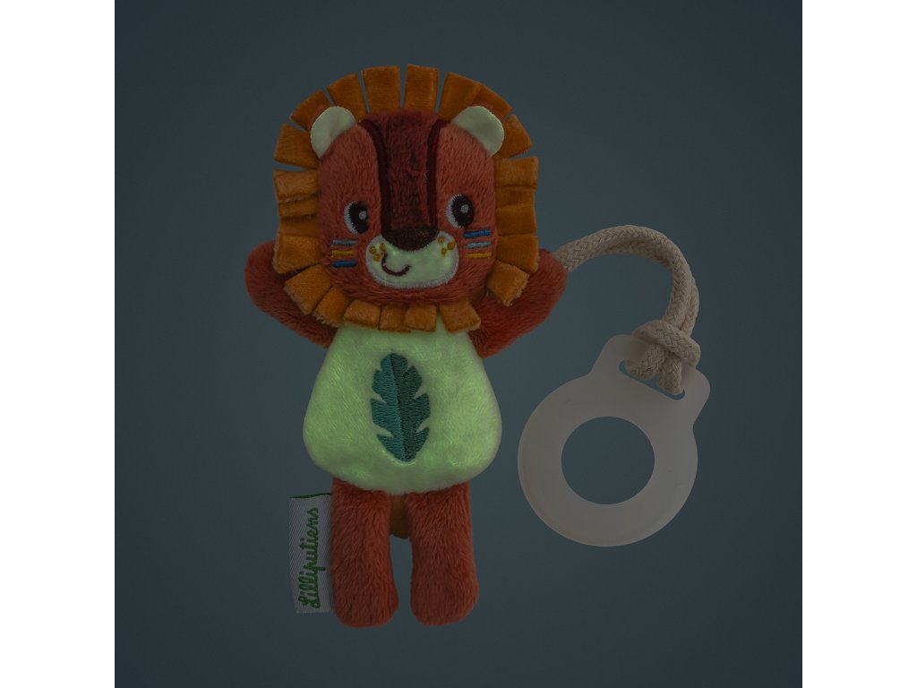 S touto malou plyšovou hračkou už žiadne stratené cumlíky uprostred noci. Vďaka roztomilému, v tme svietiacemu levíkovi nebude mať bábätko problém svoj cumlík nájsť. Jeho silikónová spona je bezpečná pre najmenších od narodenia. Je to malý mäkký a šikovný doplnok, ktorý ste potrebovali. Možno prať v práčke na 30 °C na jemný cyklus. Materiál: polyester, silikón. Rozmery: 8 cm x 1 cm x 13 cm.