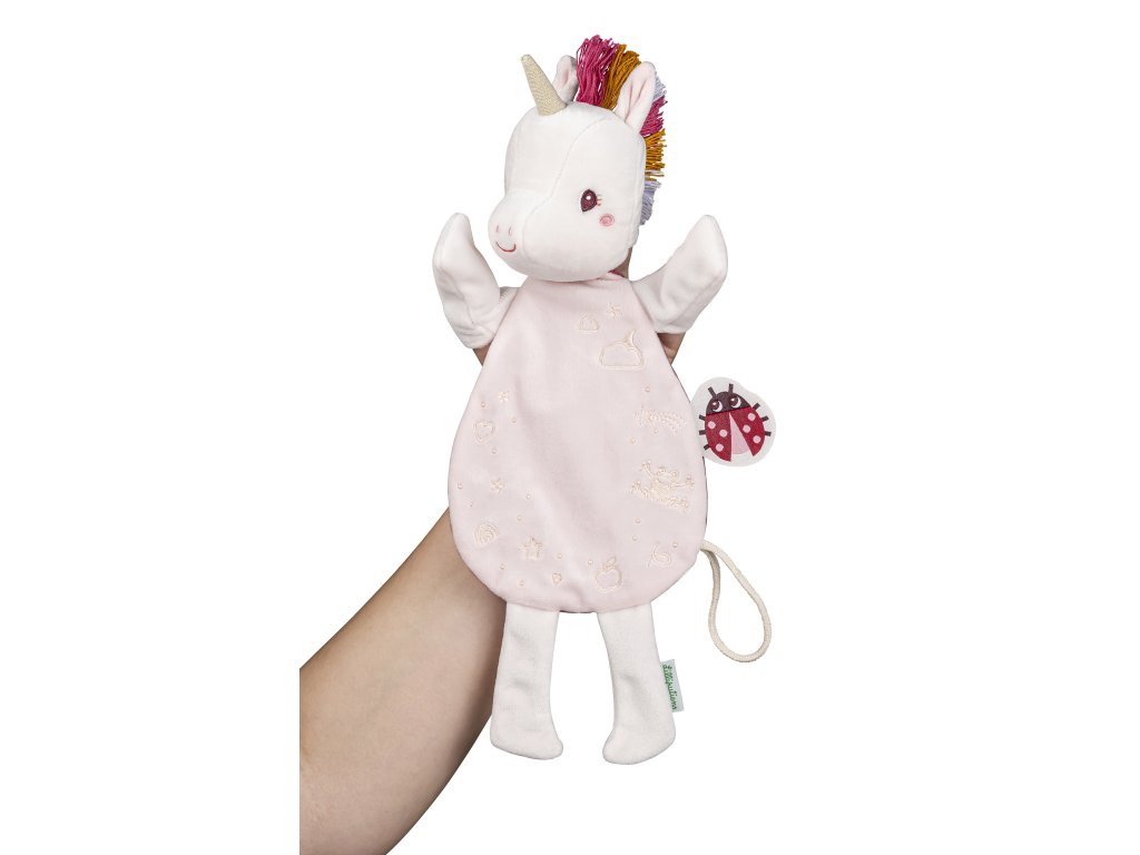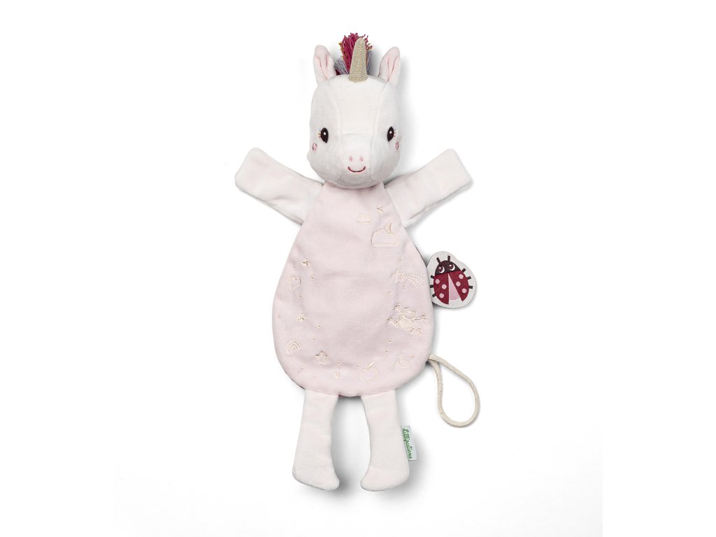 Plyšová maňuška jednorožec Lena je vhodná od narodenia. Hračka, ktorá v tme svieti, dieťa upokojuje a nikdy ju nestratí. Malým bonusom tohto plyšiaka Lilliputiens je spona na cumlík – ideálna pre to, aby sa nestratil ani vo dne, ani v noci. Možno prať v práčke na 30 °C na jemný cyklus. Materiál: polyester, bavlna. Rozmery: 18 cm x 8 cm x 35 cm.