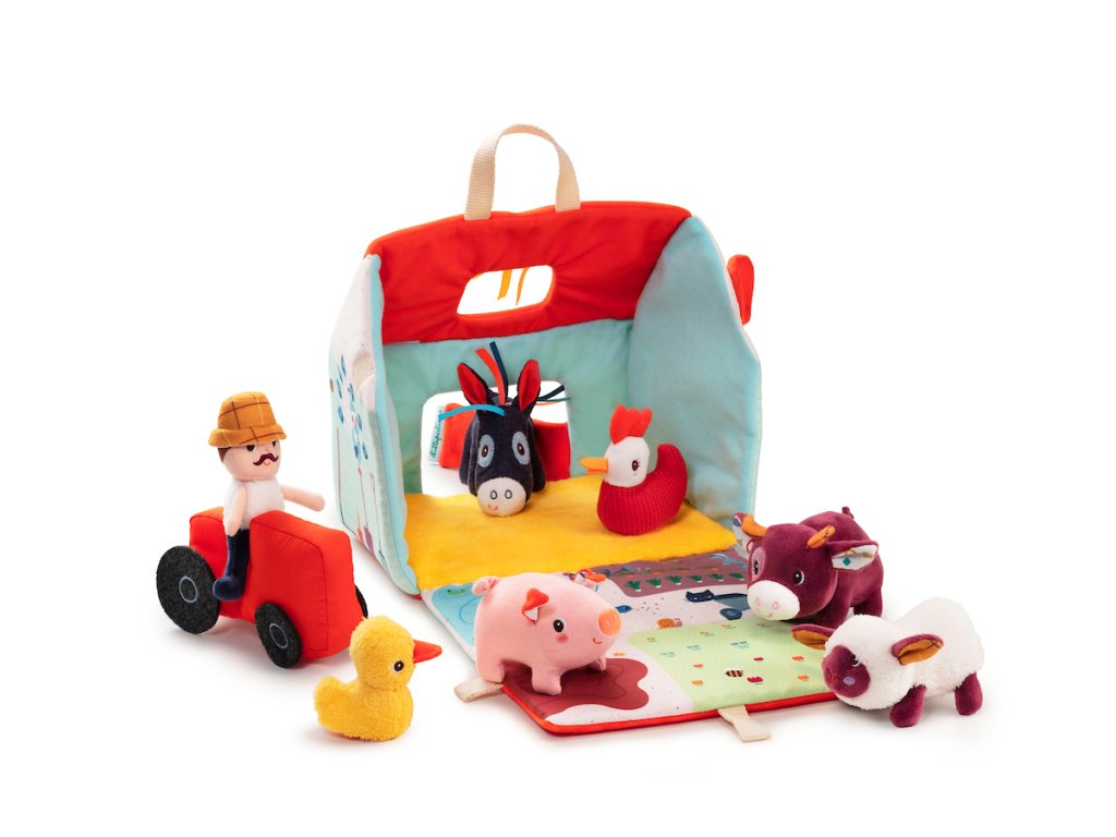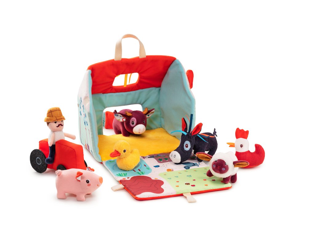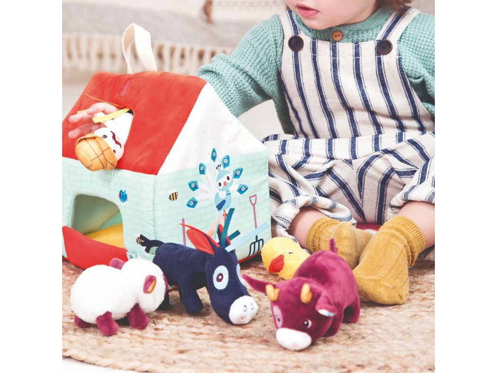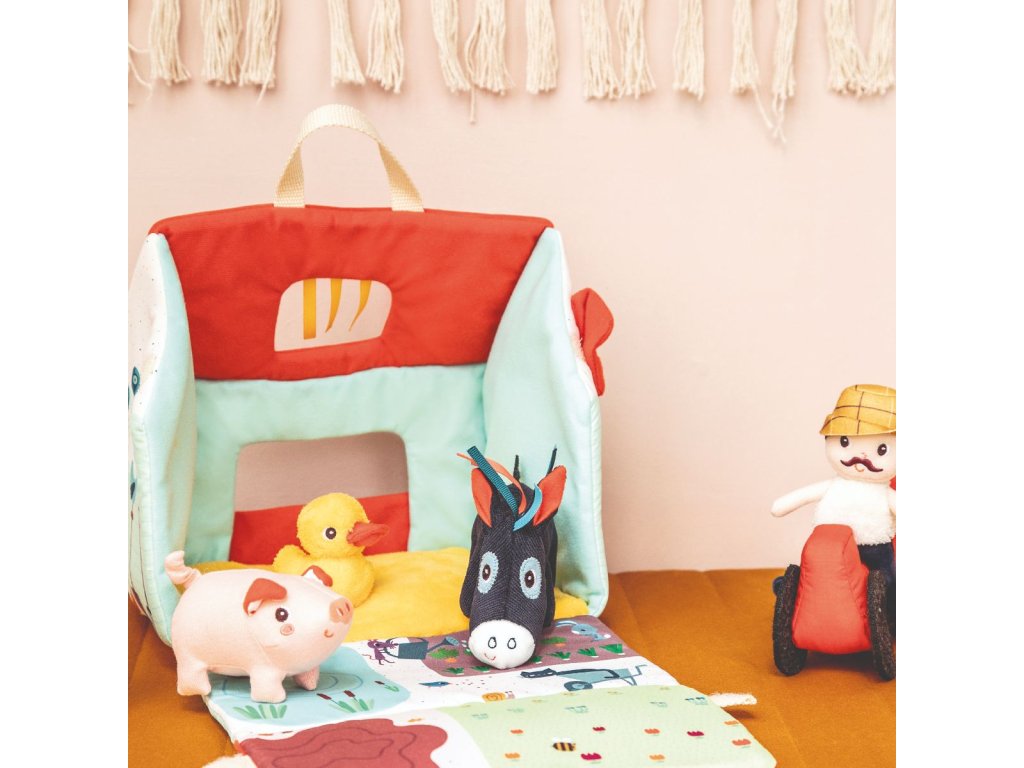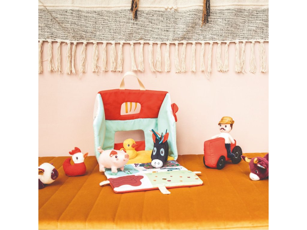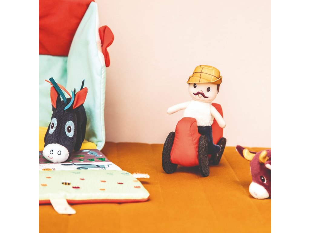 Krásna textilná farma so zvieratkami, farmárom i s traktorom. Všetko je ušité z kvalitných materiálov. Farma je krásne pestrofarebná a pre deti sú podnetné rôzne textúry. Strecha i dvere sa pripevňujú pomocou suchého zipsu.Na tejto farme panuje veselá nálada na dvore plnom zvieratiek. Oslík Ignác, prasiatko Simon, kravička Rosalie, ovečka Yvon, kuriatko Paulette a kačička Gaspart sú šťastní obyvatelia tejto farmy. Farmár jazdí na pole na traktore. Každý obyvateľ farmy tu má svoje miesto a všetci radi priložia ruku k dieluDomček má rukoväť, deti ho tak môžu jednoducho prenášať z miesta na miesto. Stačí otvoriť dvere a už sa môžu odvíjať veselé príbehy farmára a jeho zvieratiek. Pre najmenšie deti je táto hračka ako cesta za poznaním. Rozmery uzatvoreného domu sú 22 x 23 x 16 cm. Možno prať v práčke pri 30 °C na jemný cyklus. Vyrobené z kvalitného 100 % polyesteru. Ideálna hračka pre deti od 18 mesiacov.