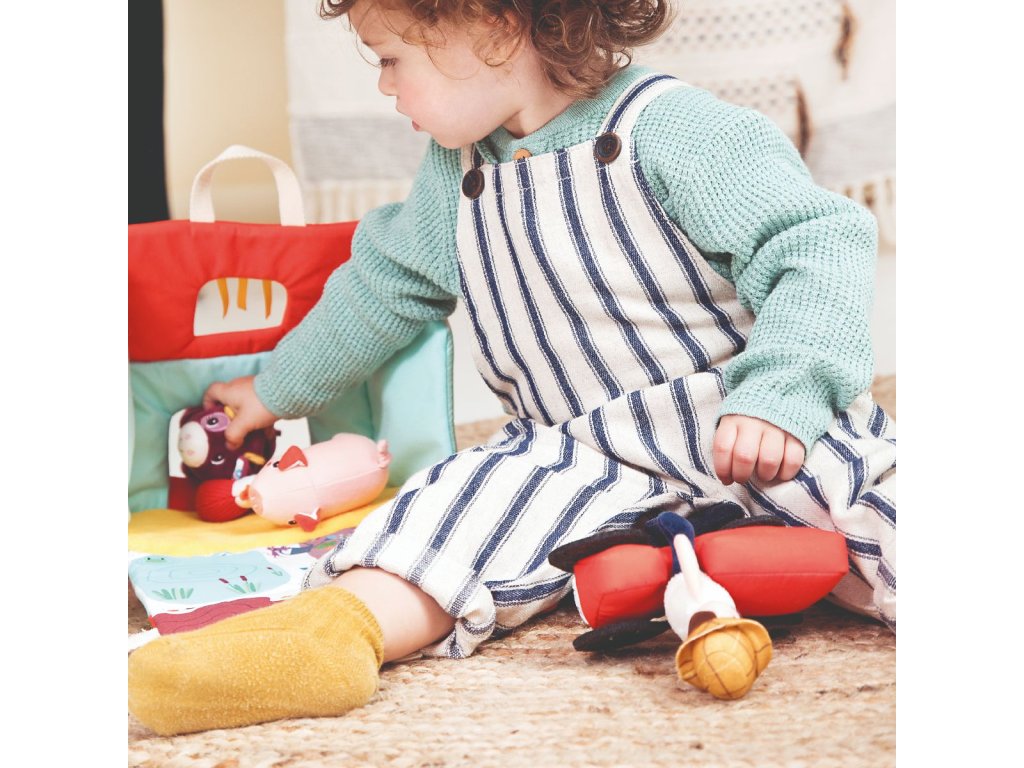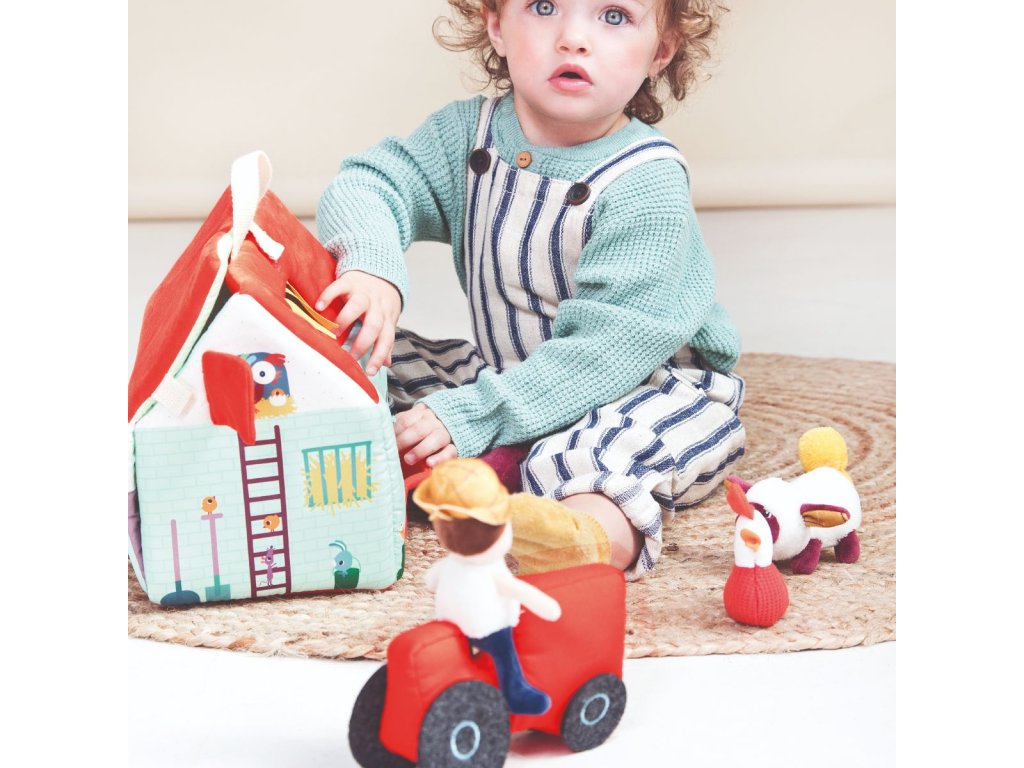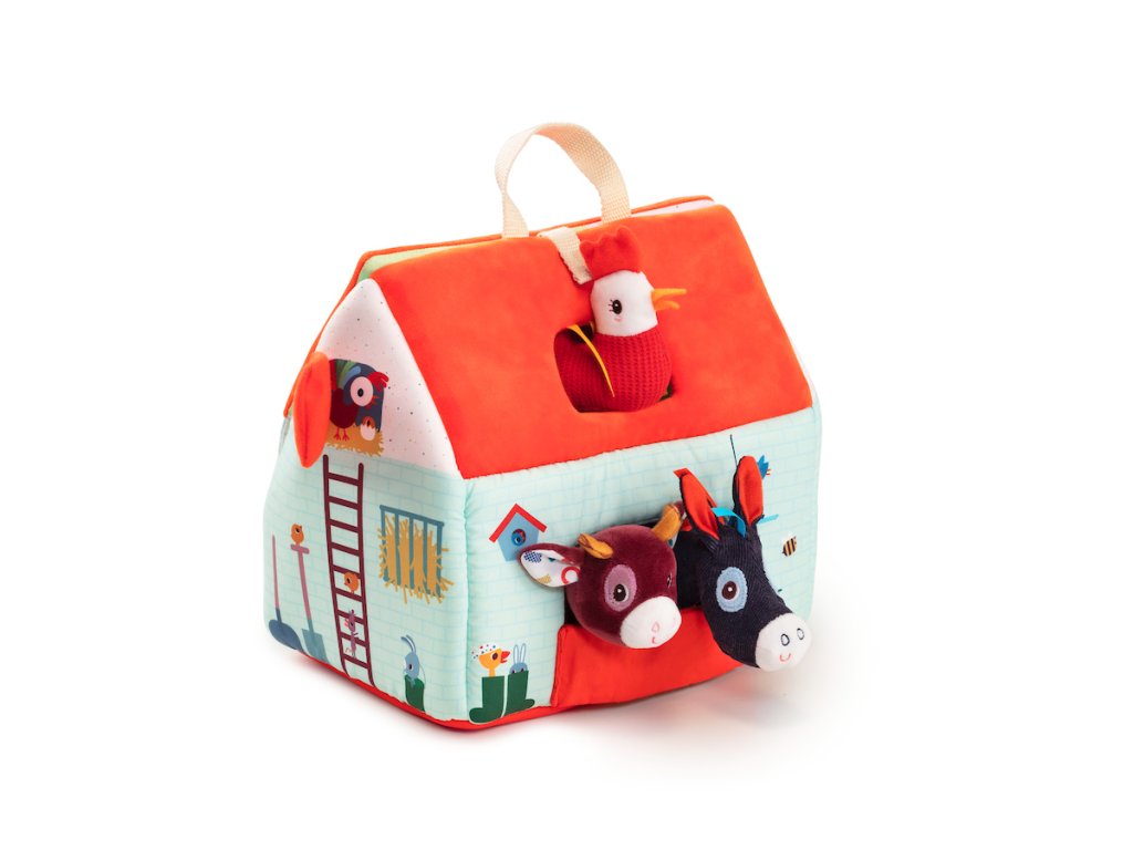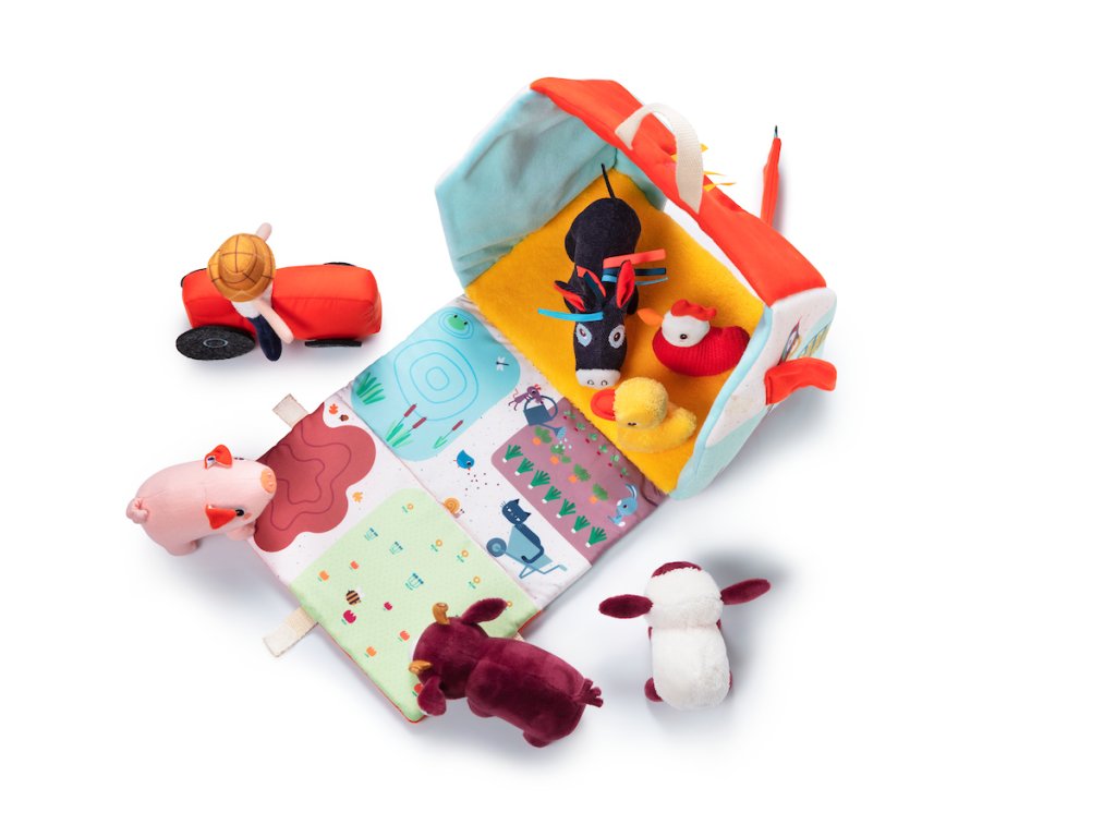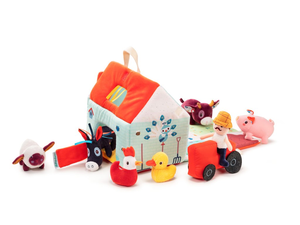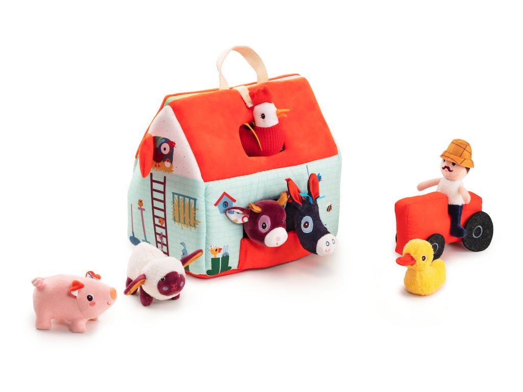 Krásna textilná farma so zvieratkami, farmárom i s traktorom. Všetko je ušité z kvalitných materiálov. Farma je krásne pestrofarebná a pre deti sú podnetné rôzne textúry. Strecha i dvere sa pripevňujú pomocou suchého zipsu.Na tejto farme panuje veselá nálada na dvore plnom zvieratiek. Oslík Ignác, prasiatko Simon, kravička Rosalie, ovečka Yvon, kuriatko Paulette a kačička Gaspart sú šťastní obyvatelia tejto farmy. Farmár jazdí na pole na traktore. Každý obyvateľ farmy tu má svoje miesto a všetci radi priložia ruku k dieluDomček má rukoväť, deti ho tak môžu jednoducho prenášať z miesta na miesto. Stačí otvoriť dvere a už sa môžu odvíjať veselé príbehy farmára a jeho zvieratiek. Pre najmenšie deti je táto hračka ako cesta za poznaním. Rozmery uzatvoreného domu sú 22 x 23 x 16 cm. Možno prať v práčke pri 30 °C na jemný cyklus. Vyrobené z kvalitného 100 % polyesteru. Ideálna hračka pre deti od 18 mesiacov.