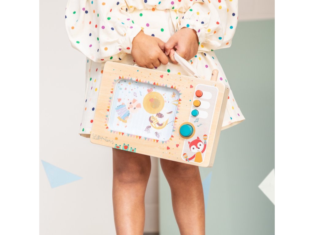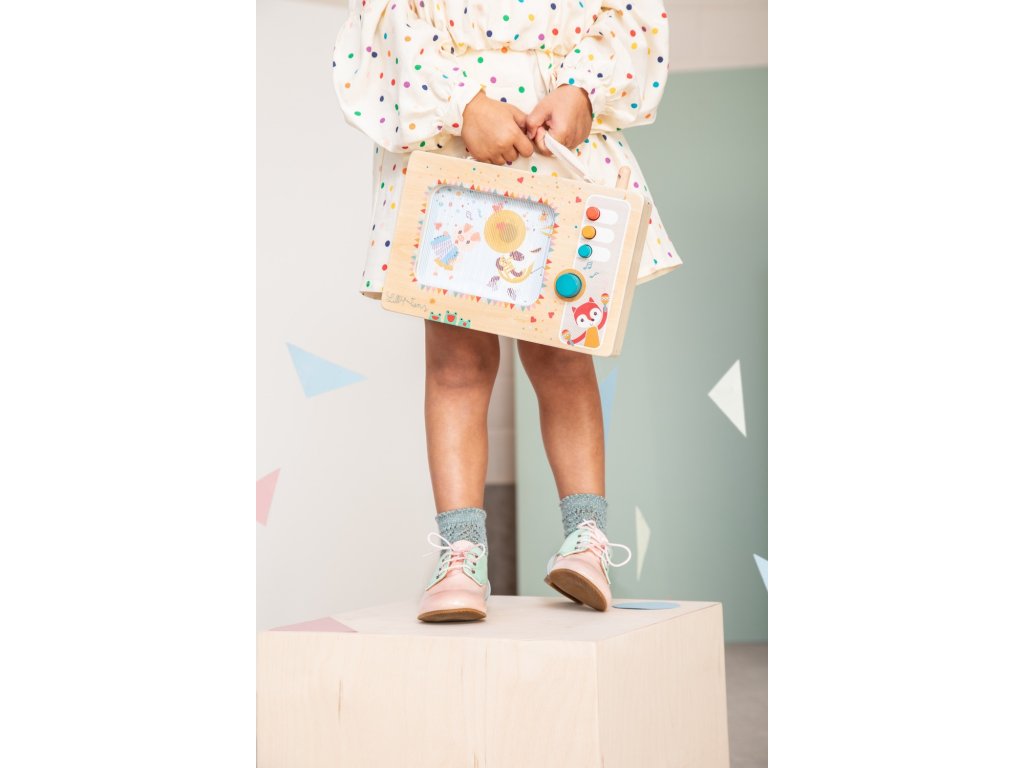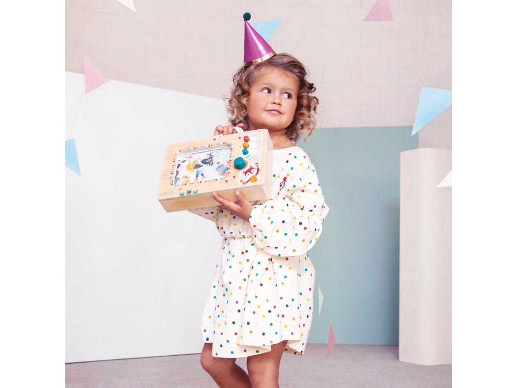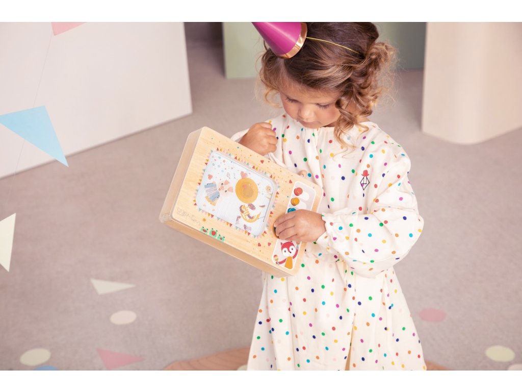 Originálna a podnetná prvá hracia skrinka pre deti od 10 mesiacov rozvíja motoriku aj zmysly. Stačí rýchlo otočiť tlačidlo na hracej skrinke a orchester sa rozoznie a zaspieva radostnú melódiu. Zároveň s hudbou sa aktivujú aj obrázky. Vďaka rukoväti možno skrinku jednoducho prenášať. Hračka je vyrobená z preglejky z bukového dreva a plastu s certifikáciou FSC. Rozmery hračky sú 24 x 5 x 18,5 cm. Povrch je umývateľný.
