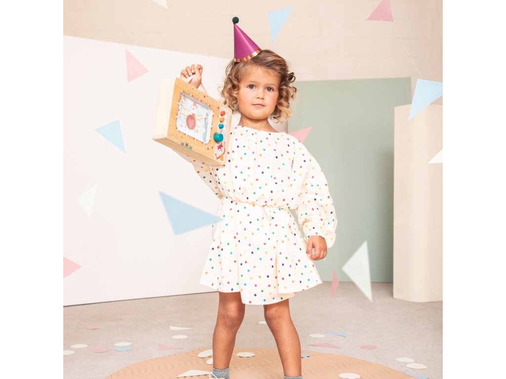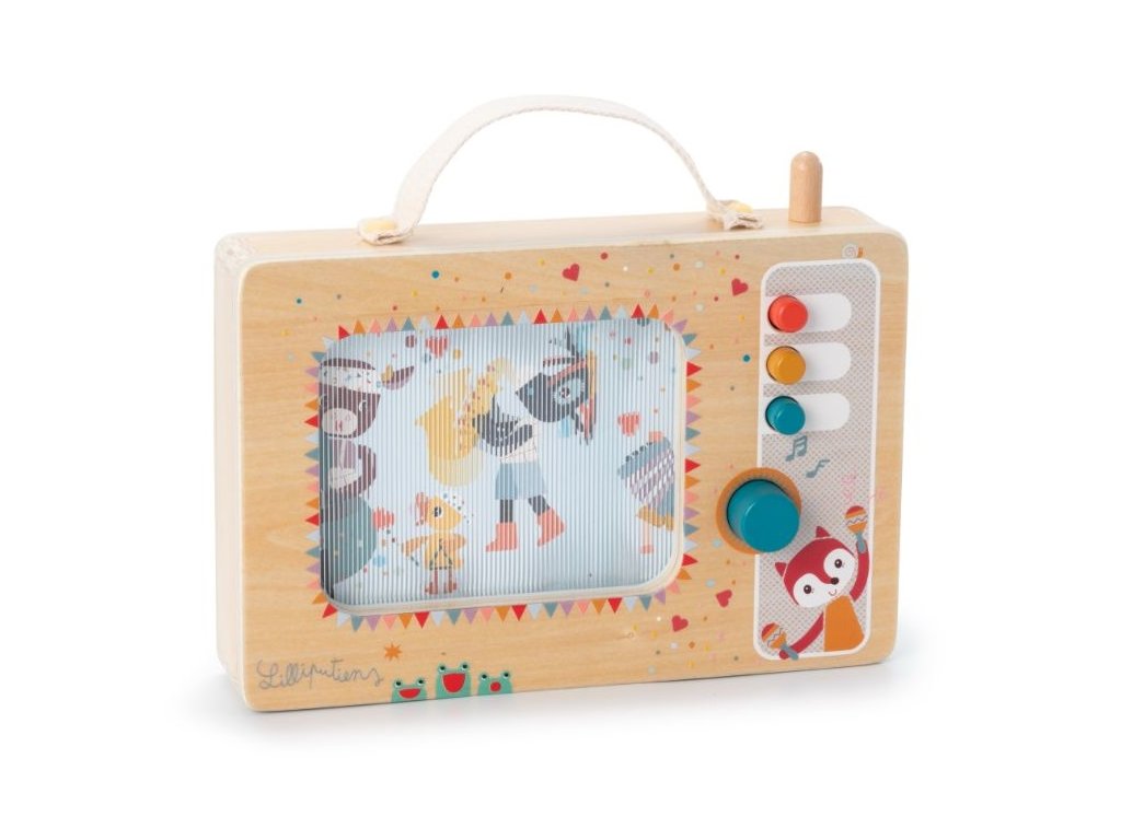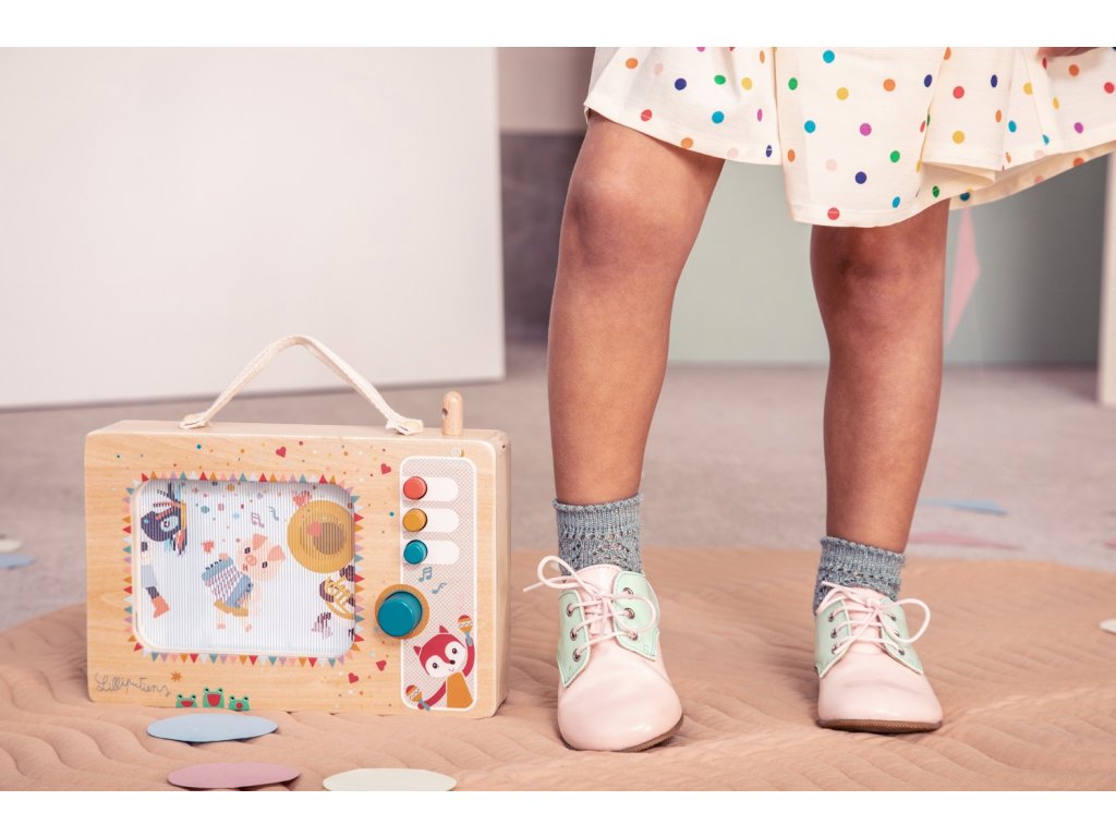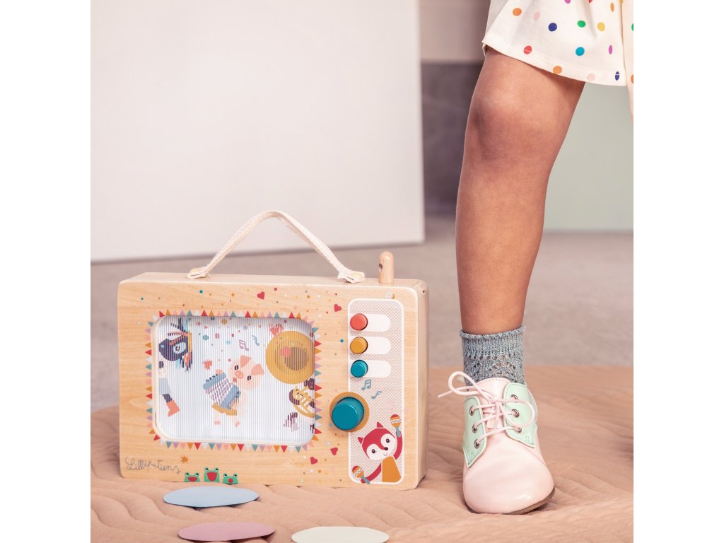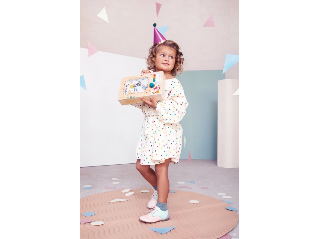 Originálna a podnetná prvá hracia skrinka pre deti od 10 mesiacov rozvíja motoriku aj zmysly. Stačí rýchlo otočiť tlačidlo na hracej skrinke a orchester sa rozoznie a zaspieva radostnú melódiu. Zároveň s hudbou sa aktivujú aj obrázky. Vďaka rukoväti možno skrinku jednoducho prenášať. Hračka je vyrobená z preglejky z bukového dreva a plastu s certifikáciou FSC. Rozmery hračky sú 24 x 5 x 18,5 cm. Povrch je umývateľný.