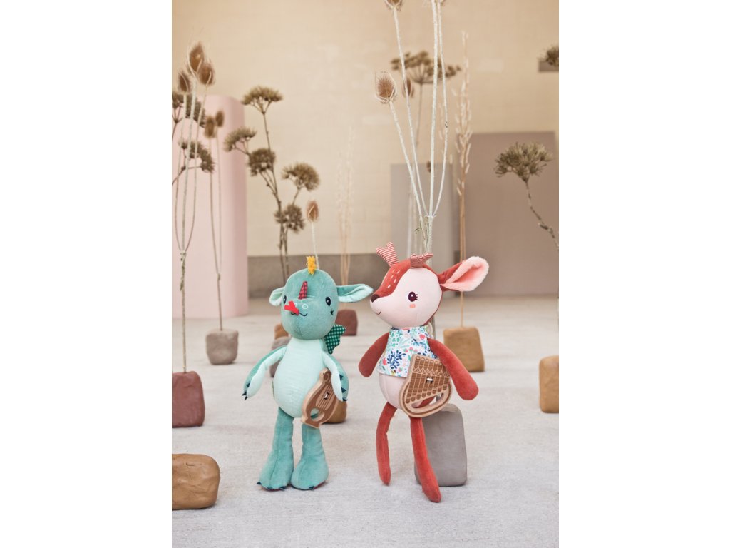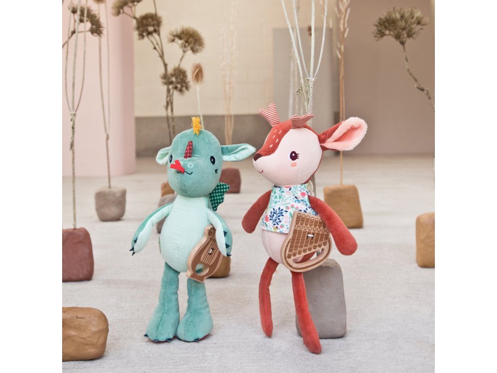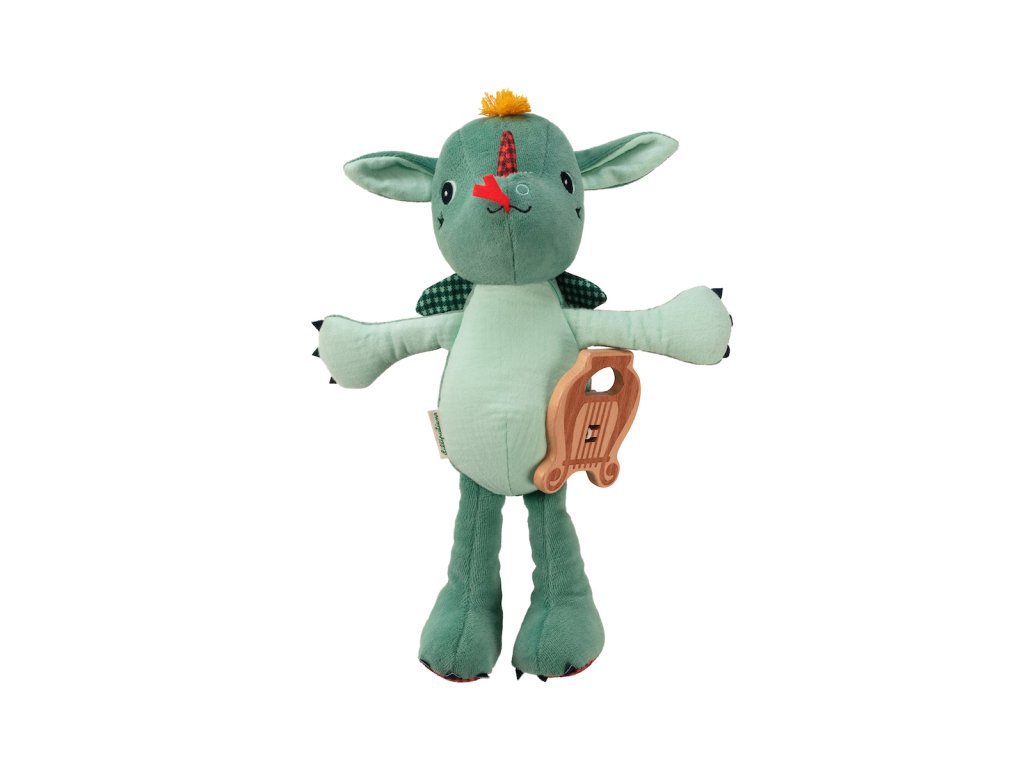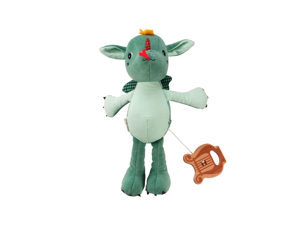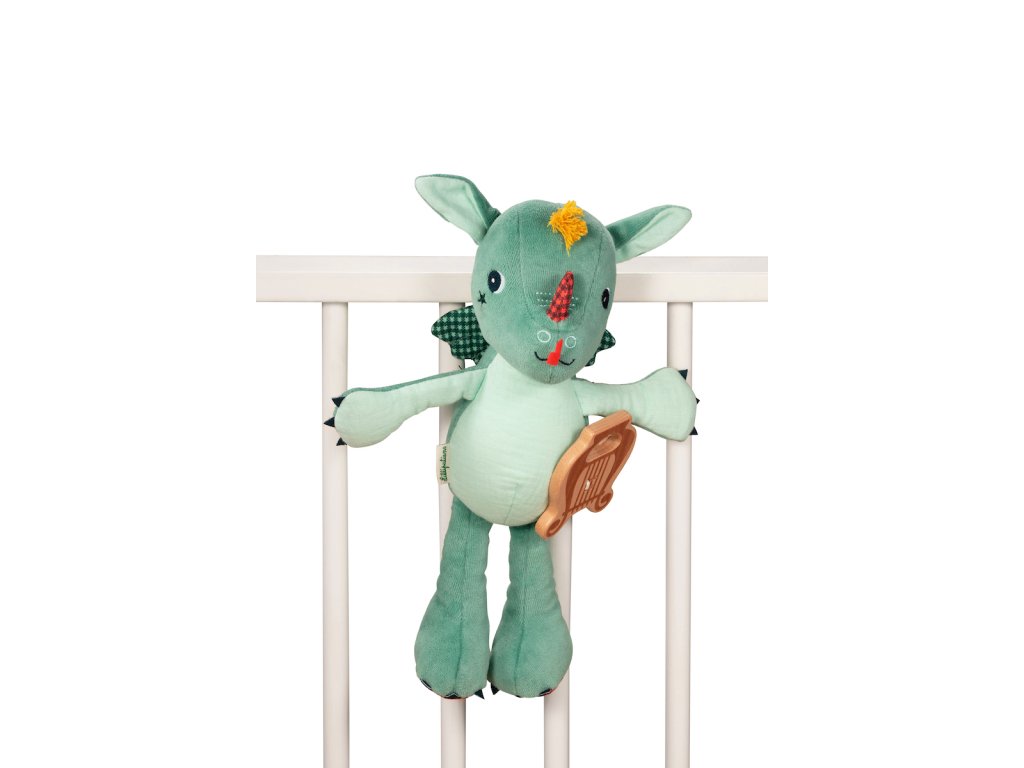 Hračka z organickej bavlny pre deti už od narodenia. Joe má vo vnútri ukrytý hudobný strojček, ktorý hrá melódiu známej pesničky „Green Sleeve“. Stačí zatiahnuť za drevený nástroj a melódia sa spustí. Dráčika možno zavesiť i na postieľku. Ideálna na uspávanie detí. Možno prať v práčke na 30 °C na jemný cyklus po odobratí hudobného strojčeka a dreveného nástroja. Použité materiály: 100 % organická bavlna a FSC drevo. Výplň hračky je 100 % recyklovaný polyester (certifikácia GRS). Rozmery hračky sú 32 x 20 x 17 cm.