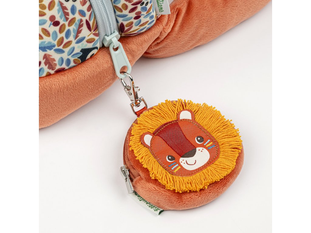 Malé vrecúško na veľké poklady je skvelým tipom na darček pre malých objaviteľov! Roztomilá peňaženka s motívom leva Jacka je ideálna pre deti od 2 rokov, ktoré si chcú schovať svoje prvé úspory alebo poklady nájdené pri dobrodružstvách. Praktický guľatý tvar a zapínanie na zips uľahčujú manipuláciu aj malým ručičkám. Vďaka karabínke ju možno ľahko pripnúť na batôžtek či kabelku, takže ju deti len tak nestratia. Peňaženka je vyrobená z kvalitného polyesteru a bavlny. Peňaženku možno prať v práčke na 30 °C na jemný cyklus. Materiál: polyester, bavlna, kov. Rozmery: 8 cm x 3 cm x 12 cm.