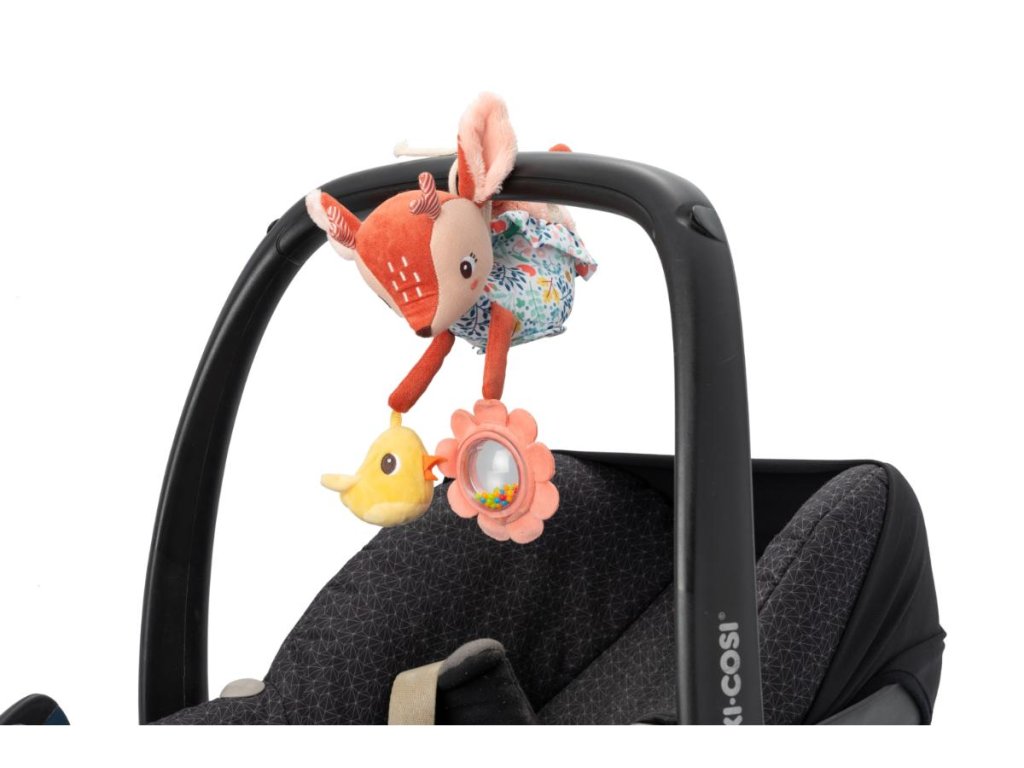 Plyšový jelenček Stella, pripevnený k detskej sedačke vyzýva deti objavovať a hrať sa. Hračka zaujme deti rôznymi zvukmi, textúrami a odrazmi svetla. Rozvíja jemnú motoriku a zmysly vášho dieťatka. Tohto roztomilého spoločníka na doma aj na cesty možno ľahko pripevniť nad postieľku, na sedačku alebo na hraciu hrazdičku. Starším deťom dráčika zložíme a môže sa tak stať obľúbeným plyšovým kamarátom na spanie. Materiál: polyester, bavlna. Rozmery hračky sú 24 x 7,5 x 25 cm. Ideálny vek pre hru s touto hračkou je od 3 mesiacov. Možno v práčke na 30 °C – šetrný cyklus.
