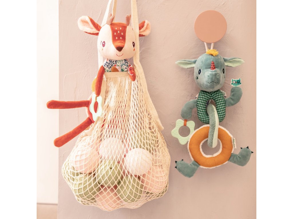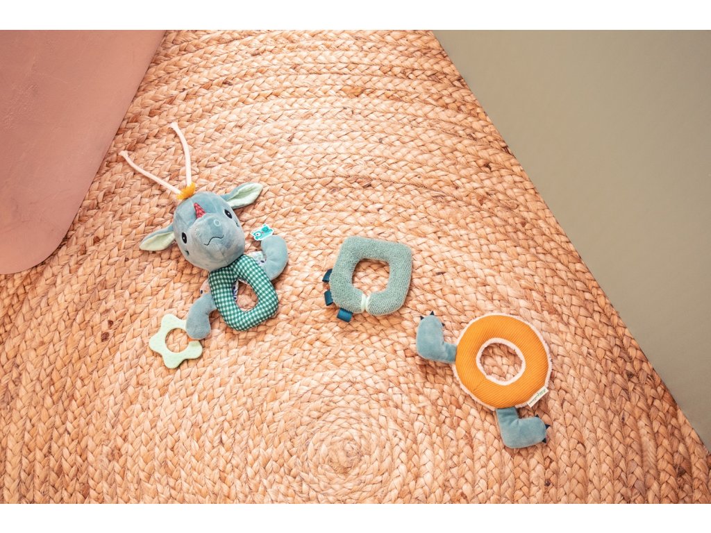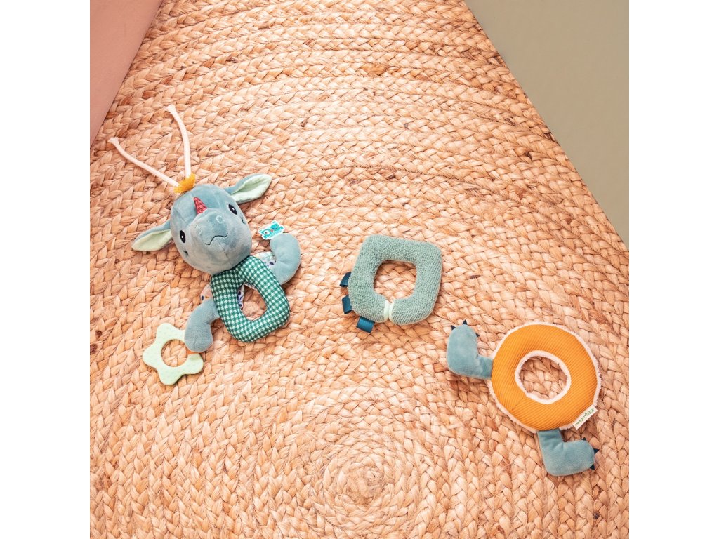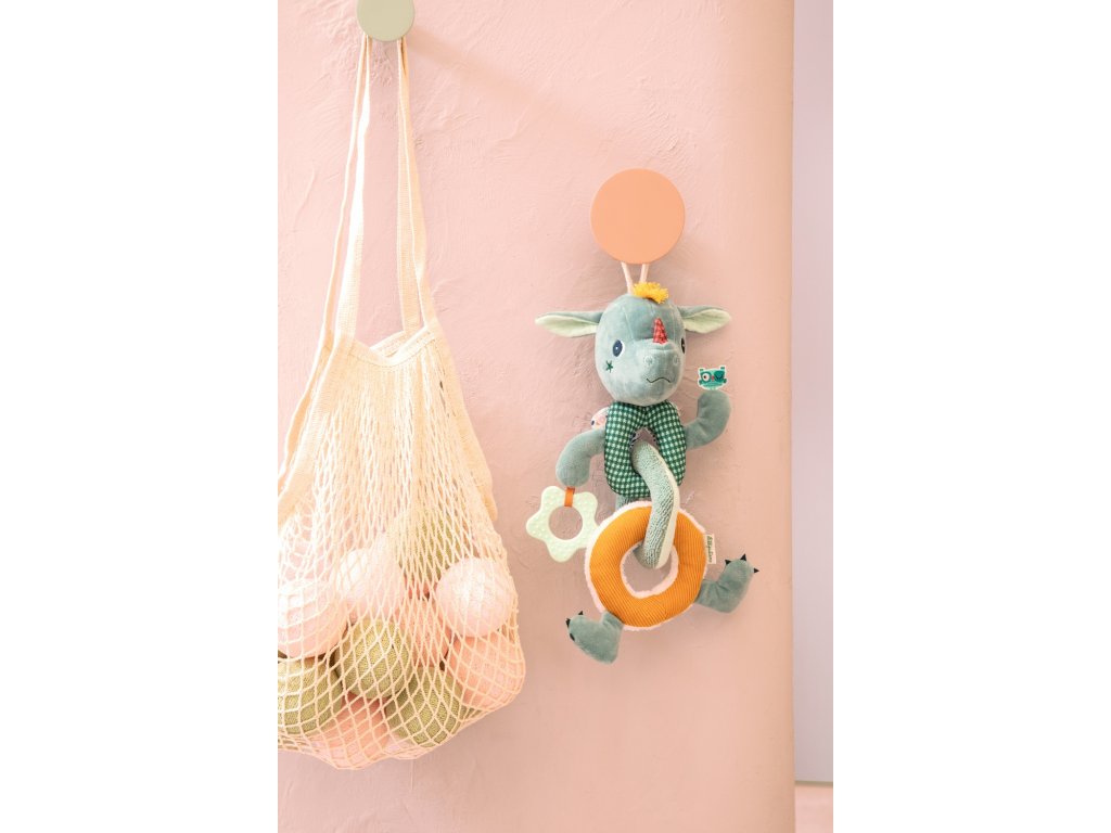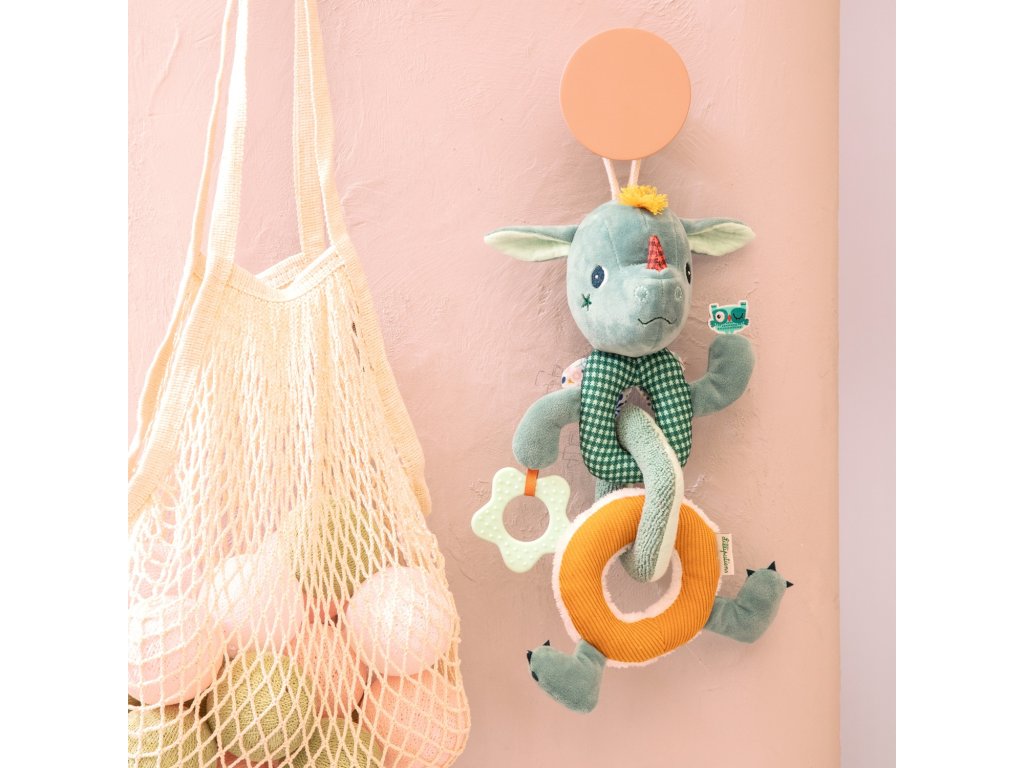 Táto zábavná plyšová reťaz s obľúbeným dráčikom má mnoho aktivít, ktoré stimulujú zmysly malých batoliat. Rôzne zvuky (rolnička, praskanie) a textúry (zamat, froté, úplet, fleece, mušelín, potlačená bavlna), hryzací krúžok. To všetko vyzýva batoľatá na objavovanie. Hračka sa skladá z 3 častí, ktoré sú odnímateľné. Girlandu vďaka povrázku jednoducho zavesíte nad postieľku alebo hraciu deku. Hračka je určená pre deti od 6 mesiacov. Je vyrobená zo 100 % polyesteru a bavlny, možno prať na jemný program na 30 °C. Rozmery hračky sú 21 x 19 x 28 cm.