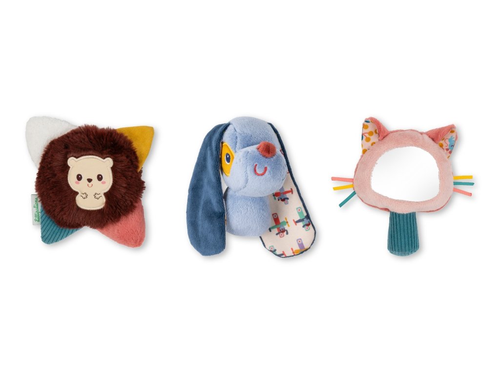 Táto súprava 3 látkových hrkálok je vhodná od narodenia. Plyšové zvieracie hrkálky prebúdzajú zvedavosť tých najmenších a stimulujú ich zmysly. Psík Jules má dlhé uši, ktoré vydávajú zábavný šuštivý zvuk, mačička Jeanne má farebné fúziky a malé zrkadielko a ježko Léon sa skladá z niekoľkých textúr, ktoré môže dieťa objavovať končekmi prstov. Ich tvar bol navrhnutý pre ľahkú manipuláciu tými najmenšími. Je to skvelý tip na darček, pretože je dodávaný v krásnej škatuľke. Možno prať na ručné pranie. Materiál: polyester. Rozmery: 30 cm x 8 cm x 12 cm.