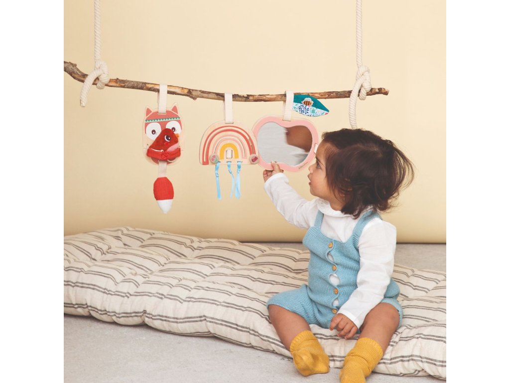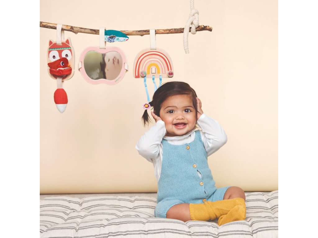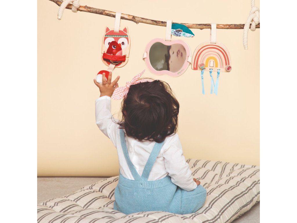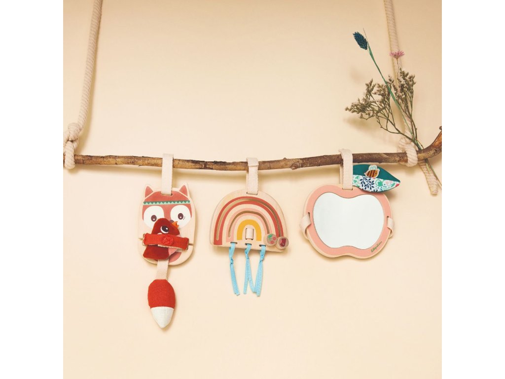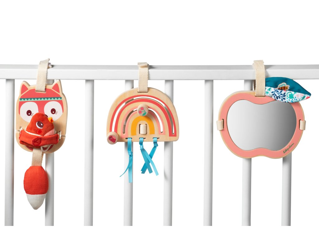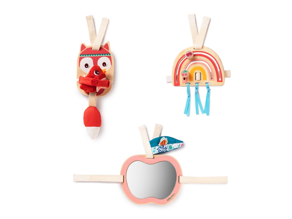 Táto súprava sa skladá z 3 samostatných prvkov. Všetky sa ľahko pripevňujú k postieľke či ohrádke a každý panel ponúka deťom širokú škálu rôznych materiálov a činností. S touto hračkou máte istotu, že v postieľke bude mať váš drobček čo robiť a na čo sa dívať. Súprava je určená pre deti od 9 mesiacov. Hračky sú vyrobené z bukového dreva (FSC), 100 % polyesteru a použité farby sú na vodnej báze. Povrch hračiek možno umývať vlhkou handričkou.Dodatočné parametre
