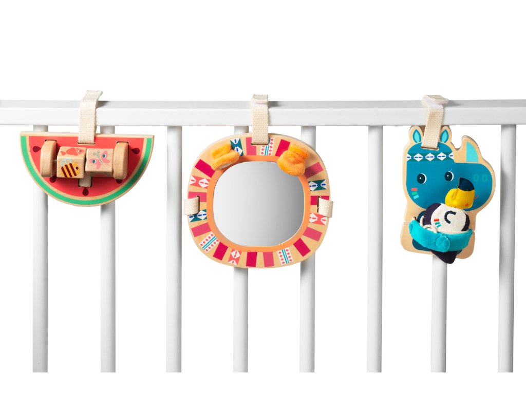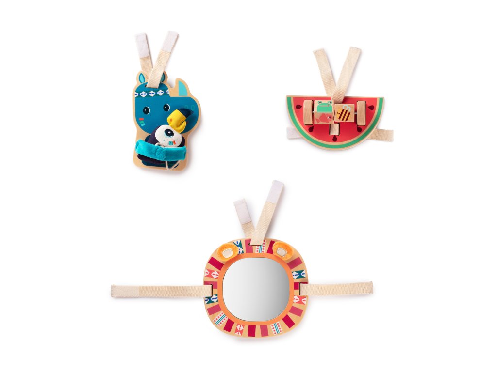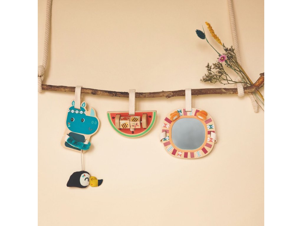 Táto súprava sa skladá z 3 samostatných prvkov. Všetky sa ľahko pripevňujú k postieľke či ohrádke a každý panel ponúka deťom širokú škálu rôznych materiálov a činností. S touto hračkou máte istotu, že v postieľke bude mať váš drobček čo robiť a na čo sa dívať. Súprava je určená pre deti od 9 mesiacov. Hračky sú vyrobené z bukového dreva (FSC), 100 % polyesteru a použité farby sú na vodnej báze. Povrch hračiek možno umývať vlhkou handričkou.Dodatočné parametre