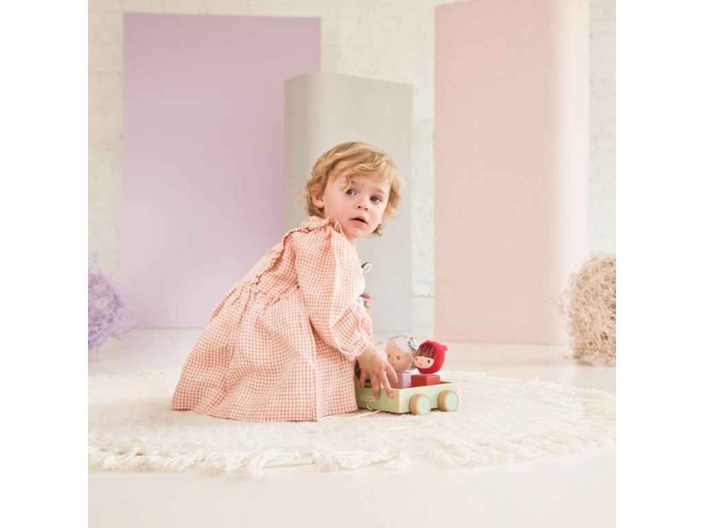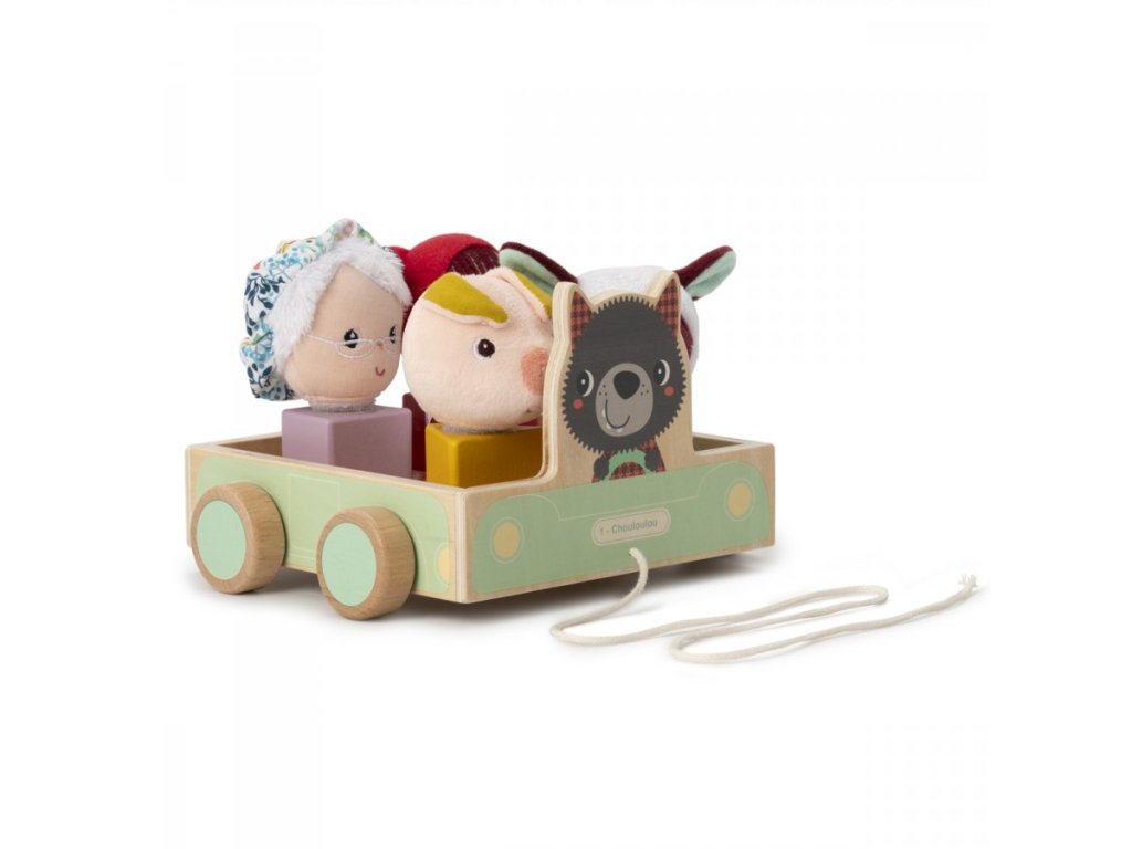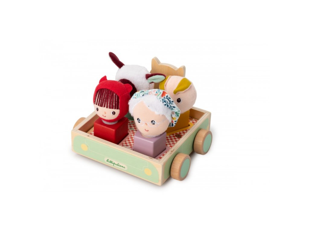 Drevený vozík vlk Ľudovít vezie babičku, Červenú Čiapočku, prasiatko a ovečku na piknikový výlet. Tento originálny vozík ponúka deťom od 12 mesiacov hneď niekoľko aktivít. Ťahaciu hračku, vkladačku, rozpoznávanie tvarov. Drevené tvary sú s hlavami postavičiek spojené pomocou suchého zipsu. Hračka zábavnou formou rozvíja motoriku a predstavivosť. Vyrobené zo 100 % bavlny, 100 % polyesteru a z dreva. Rozmery vozíka sú 19,5 x 16 x 14 cm.