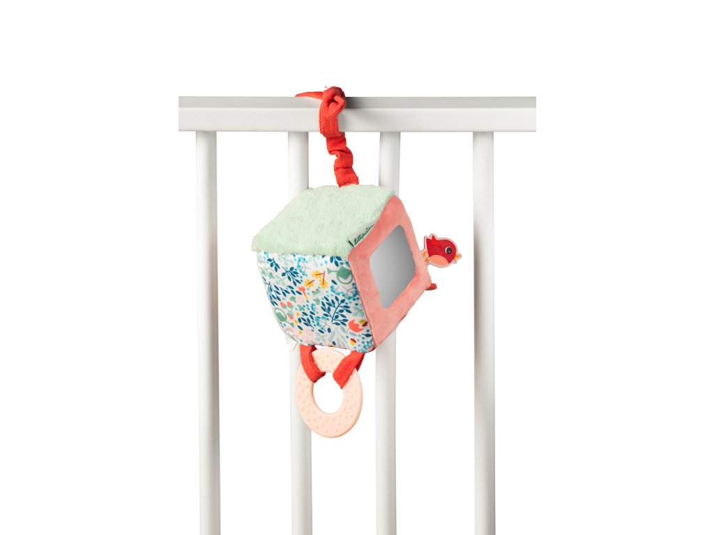 Textilná kocka je určená pre malých prieskumníkov od 3 mesiacov. Obsahuje mnoho aktivít a rozvíja zmysly a jemnú motoriku už v ranom veku detí. Hračka je ľahká, môžete ju vziať i na cesty, bude tak deti sprevádzať na každej prechádzke. Hračka rozvíja záujem detí o okolitý svet a má pre batoľatá mnoho prekvapení – na každej strane sú rôzne materiály, textúry, zvuky, zrkadielko, hryzadielko. Pekný originálny darček na pobavenie dieťaťa.Rozmery kocky: 8 x 8 x 8 cm. Materiál: 100 % polyester. Hračku možno prať na 30 °C na jemný program. Nedávať do sušičky.