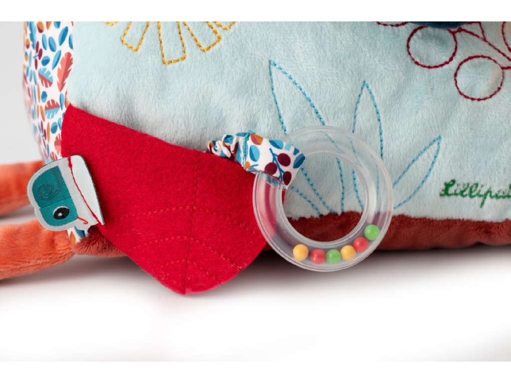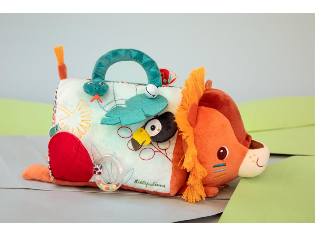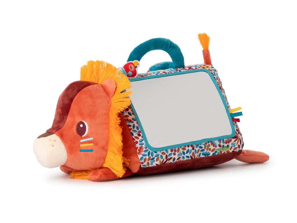 Lev Jack nie je len obyčajná hračka; je to zábavný trojuholníkový priateľ, ktorý rozvíja zmysly a fantáziu detí od 3 mesiacov. Na jednej strane tohto farebného leva je veľké zrkadlo, v ktorom môžu deti objavovať svoj odraz, zatiaľ čo na druhej strane ich čaká svet plný zábavných aktivít. Pod lístkom sa ukrýva tukan Pablo, ktorý deťom prináša radostný moment prekvapenia a objavovania. Jack je navrhnutý tak, aby stimuloval všetky zmysly vašich malých prieskumníkov. Vďaka rôznorodým textúram, pestrým farbám a hmatovým prvkom bude hranie s týmto levíčkom nielen zábavné, ale tiež prospešné pre rozvoj zmyslového vnímania. Rukoväť v tvare hada uľahčuje deťom prenášanie hračky, čo z neho robí ideálneho spoločníka na cestách. Prečo je tento levíček ideálna hračka pre vaše dieťa? – pestré farby a rôzne textúry podporujú hmatové a vizuálne vnímanie – interaktívne prvky rozvíjajú zvedavosť a logické myslenie Hračka je vyrobená z 90 % ekologických materiálov a má 100 % recyklovanú polyesterovú výplň. Umývateľný povrch umožňuje ľahkú údržbu. Rozmery hračky sú 34 x 17 x 17 cm. Lev Jack je dostatočne veľký na to, aby deti zaujal, ale zároveň dosť malý na to, aby s ním mohli malé rúčky manipulovať. Jack sa stane obľúbeným kamarátom vašich detí, pretože im ponúkne hodiny zábavy, smiechu a zmyslového objavovania.