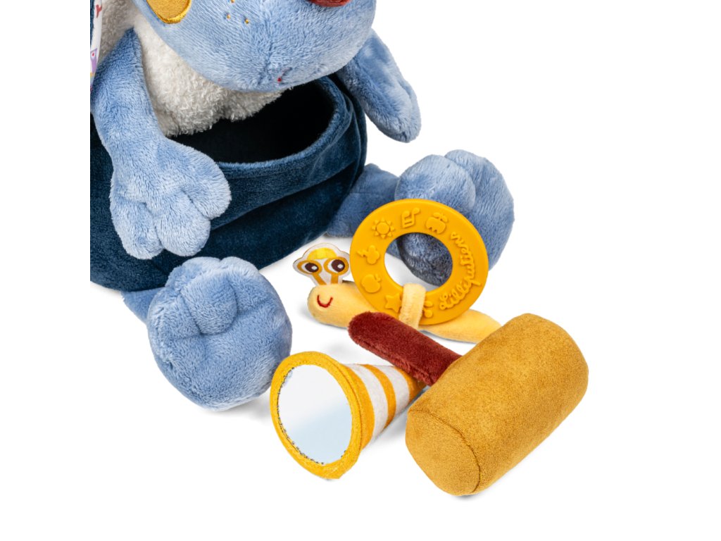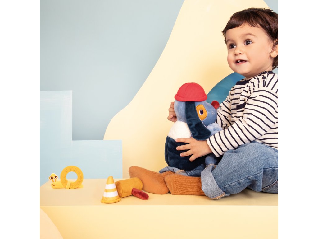 Malá oprava? Veľký projekt? Je tu údržbár psík Jules. Táto plyšová hračka je vhodná pre deti od 9 mesiacov. S rozkošným modrým psíkom deti rozvíjajú svoje motorické zručnosti a predstavivosť, ale tiež stimulujú svoje zmysly, ako je sluch a zrak. Do vrecka na brušku možno vkladať všetky nástroje potrebné pre majstrov – pruhovaný kužeľ so zrkadielkom na spodku, šuštiacu hrkálku v tvare kladiva a malého slimáka, ktorý je Julesov kamarát! Silikónový hryzací krúžok na chrbte slimáka pomáha zmierniť bolesť pri prerezávaní zúbkov. Tohto plyšového psíka možno prať v práčke na 30 °C na jemný cyklus. Kužeľ, kladivo a slimák sú však iba povrchovo umývateľné. Materiál: polyester, silikón. Rozmery: 14 cm x 18 cm x 26 cm.