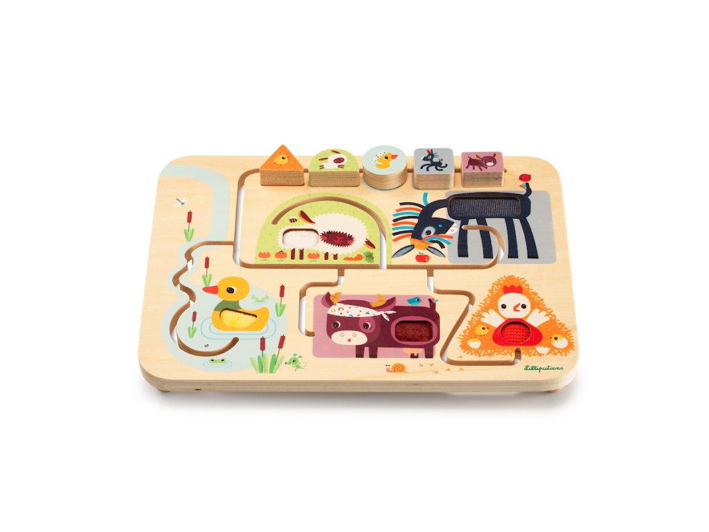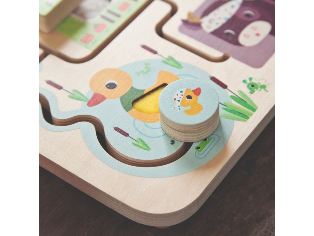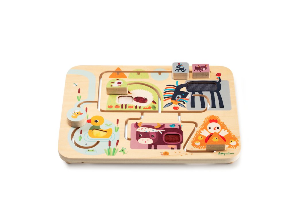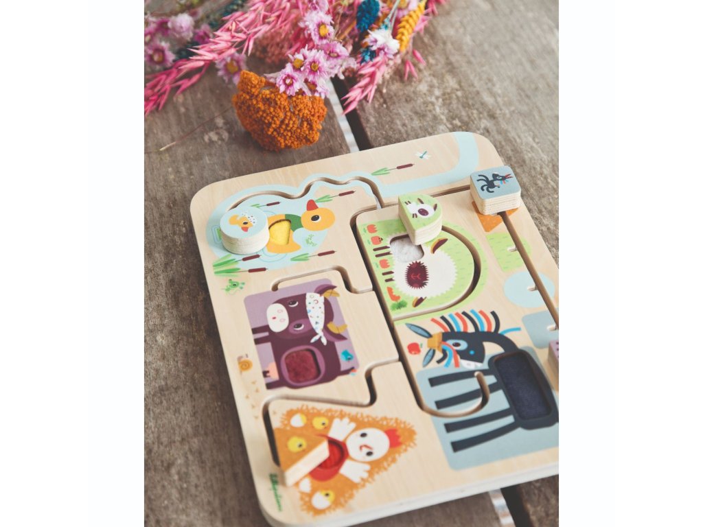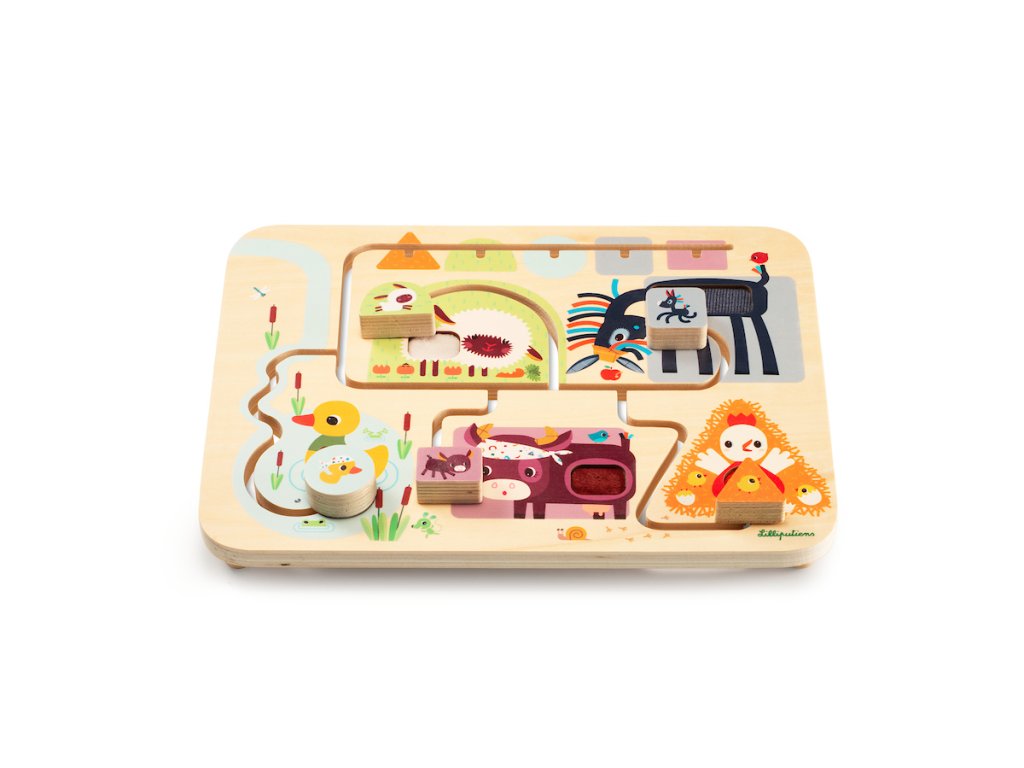 Skutočný hlavolam a výzva pre malých prieskumníkov od 18 mesiacov. Mláďatká hospodárskych zvierat nemôžu nájsť svoju mamičku alebo tatka. Dokážete im pomôcť? Dovediete ich skrz labyrint pre objatie k maminke alebo tatkovi? Potom sa opäť môžu spoločne hrať a blázniť. Pre lepšiu stabilitu je na spodnej strane panelu umiestnených 5 nožičiek. Veľké zvieratá majú na brušku rôzne textúrované tkaniny.Rozmery labyrintu sú 29 x 22 x 2 cm. Hračka je vyrobená z bukového dreva s certifikáciou FSC a 100 % recyklovaného polyesteru. Použité farby sú na vodnej báze a pre deti úplne neškodné.Dodatočné parametre