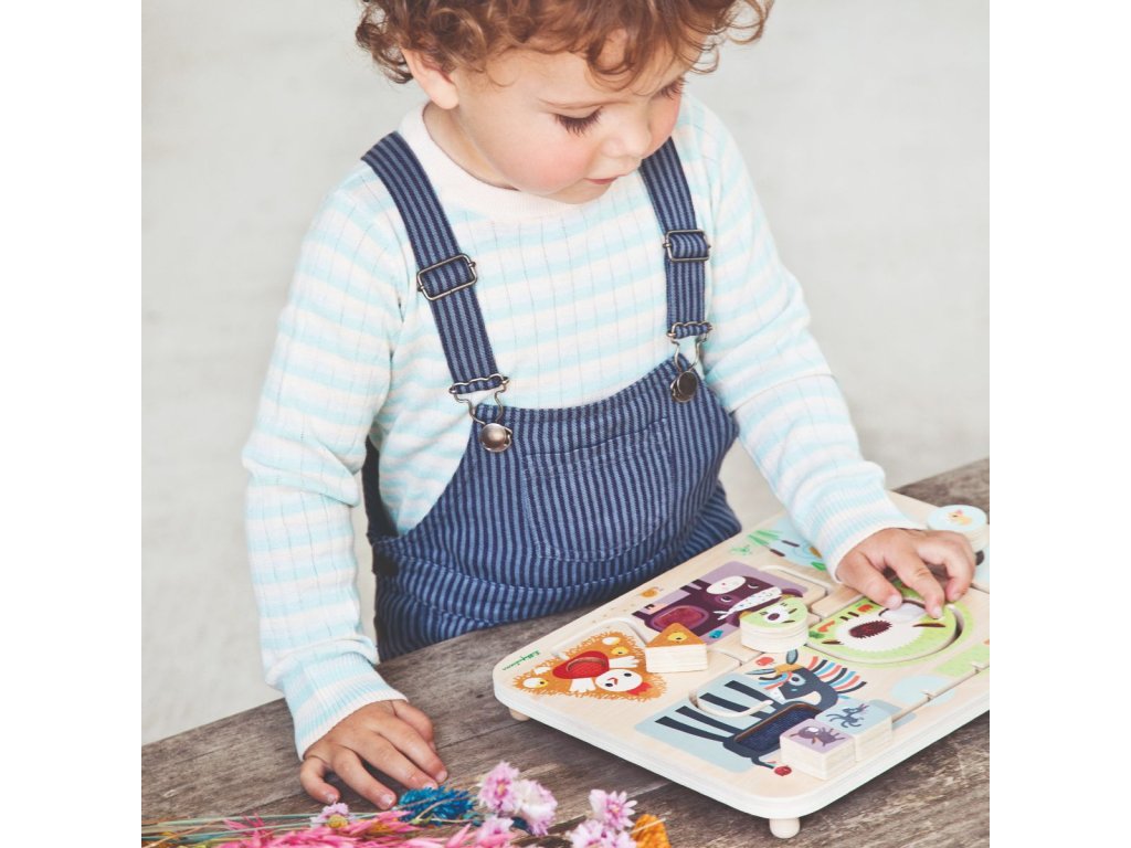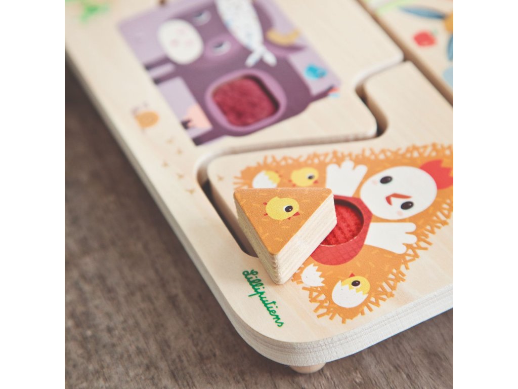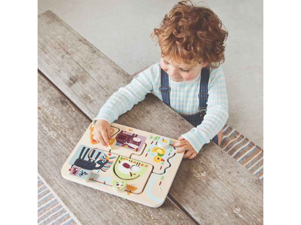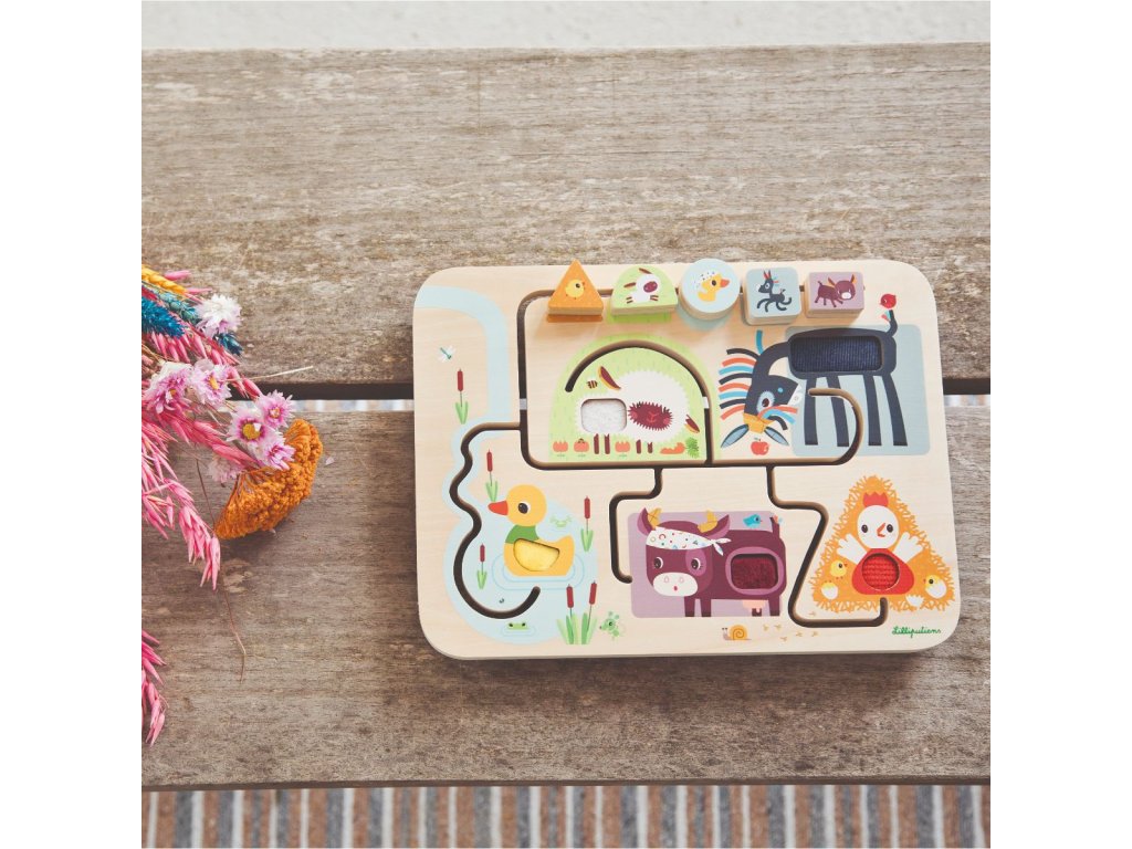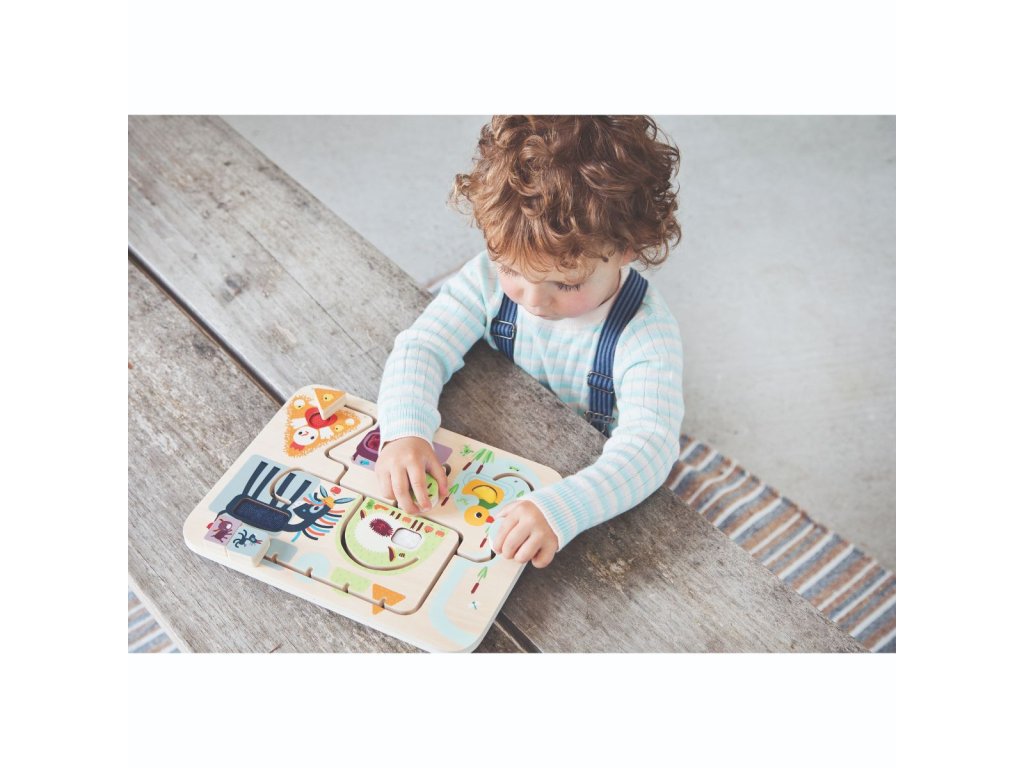 Skutočný hlavolam a výzva pre malých prieskumníkov od 18 mesiacov. Mláďatká hospodárskych zvierat nemôžu nájsť svoju mamičku alebo tatka. Dokážete im pomôcť? Dovediete ich skrz labyrint pre objatie k maminke alebo tatkovi? Potom sa opäť môžu spoločne hrať a blázniť. Pre lepšiu stabilitu je na spodnej strane panelu umiestnených 5 nožičiek. Veľké zvieratá majú na brušku rôzne textúrované tkaniny.Rozmery labyrintu sú 29 x 22 x 2 cm. Hračka je vyrobená z bukového dreva s certifikáciou FSC a 100 % recyklovaného polyesteru. Použité farby sú na vodnej báze a pre deti úplne neškodné.Dodatočné parametre